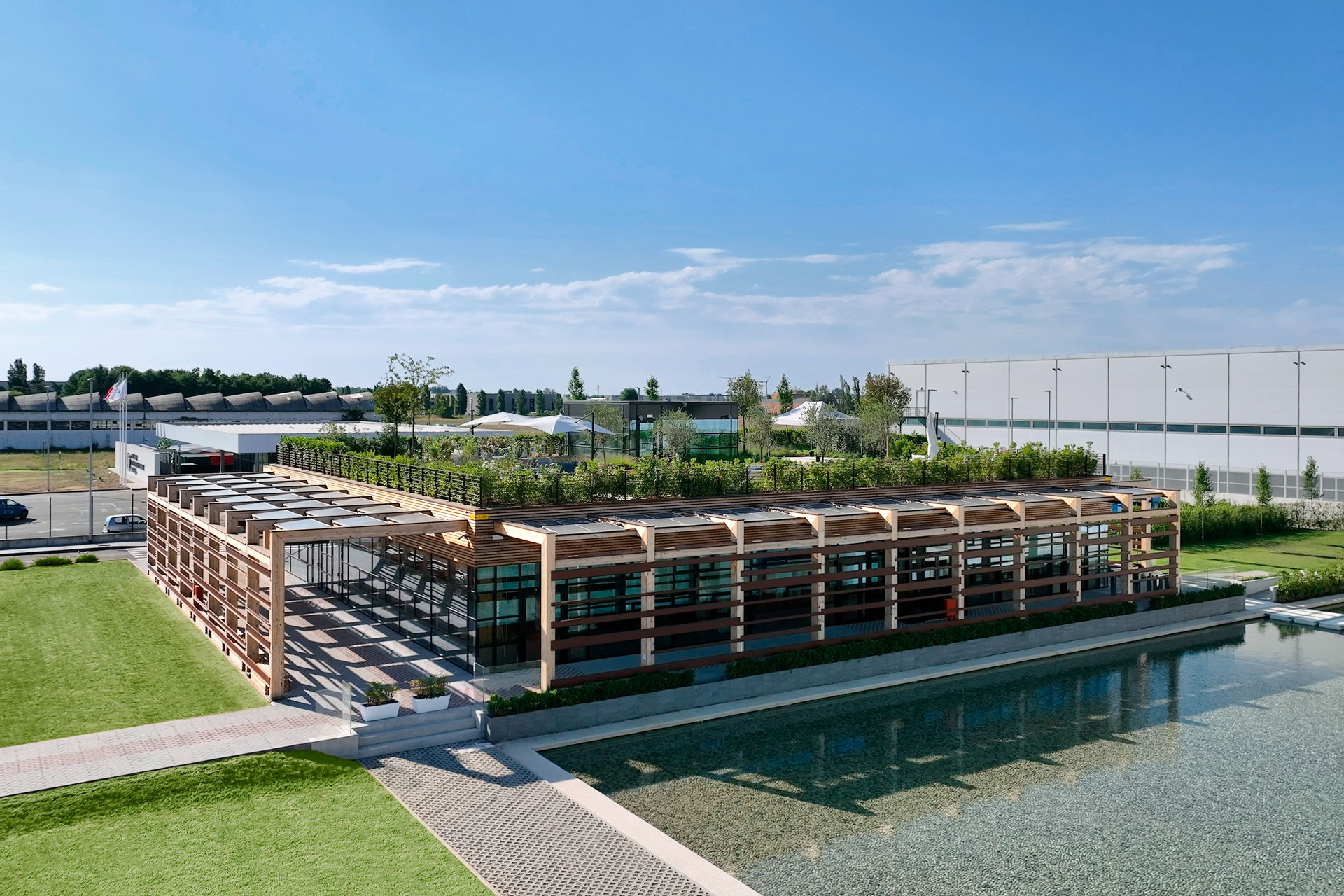 Wolf Haus è stata premiata nella categoria Migliori imprese o Amministrazioni per l’edilizia green per la realizzazione del Centro P.M. Institute for Manufactoring Competences a Crespellano (BO), che impiega soluzioni, materiali e tecniche avanzate. Una pergola continua distribuisce una schermatura permeabile e offre l'occasione per installare una pelle verde avvolgente e un sistema di pannelli fotovoltaici integrati, il tetto giardino completa l'edificio.