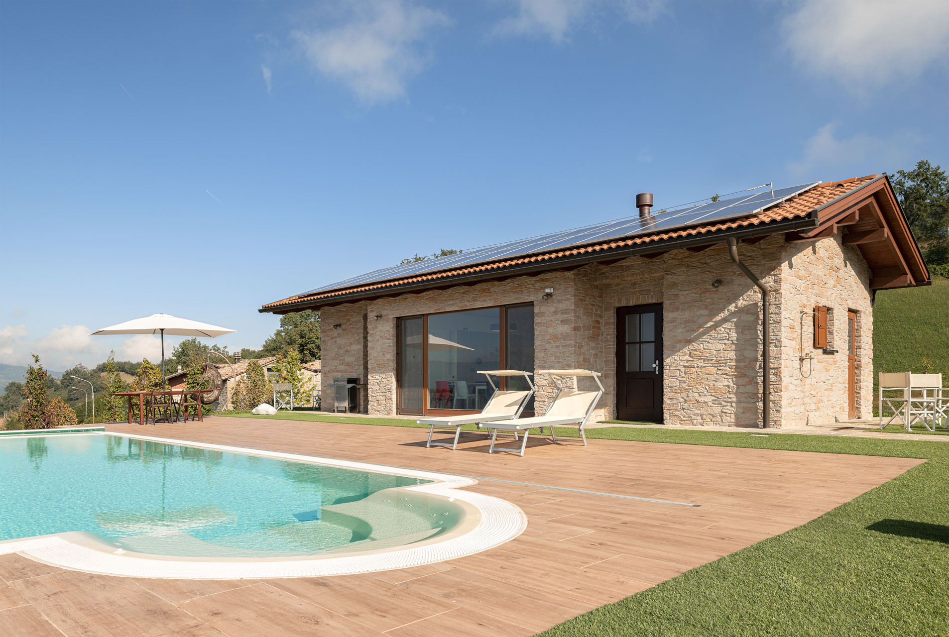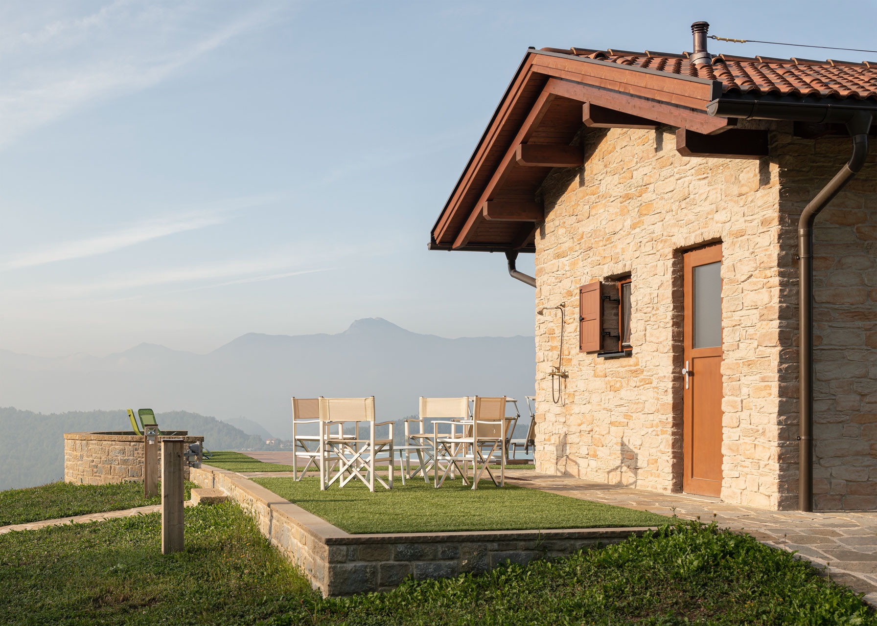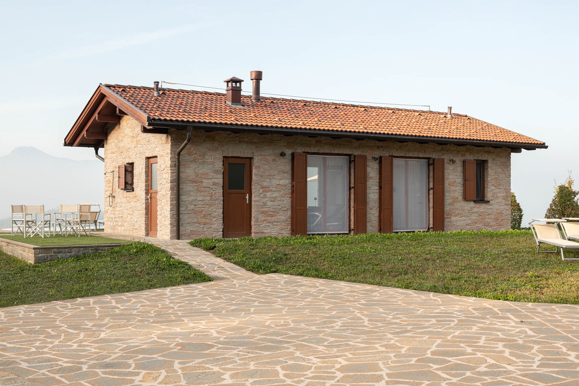 Die architektonischen und konstruktiven Merkmale des kleinen Holzhauses, das mit lokalem Stein verkleidet ist, und das sich so in die Umgebung einfügt und mit den rustikalen Gebäuden entlang des Hangs harmoniert, sorgen für maximalen akustischen, thermischen und lichttechnischen Komfort.