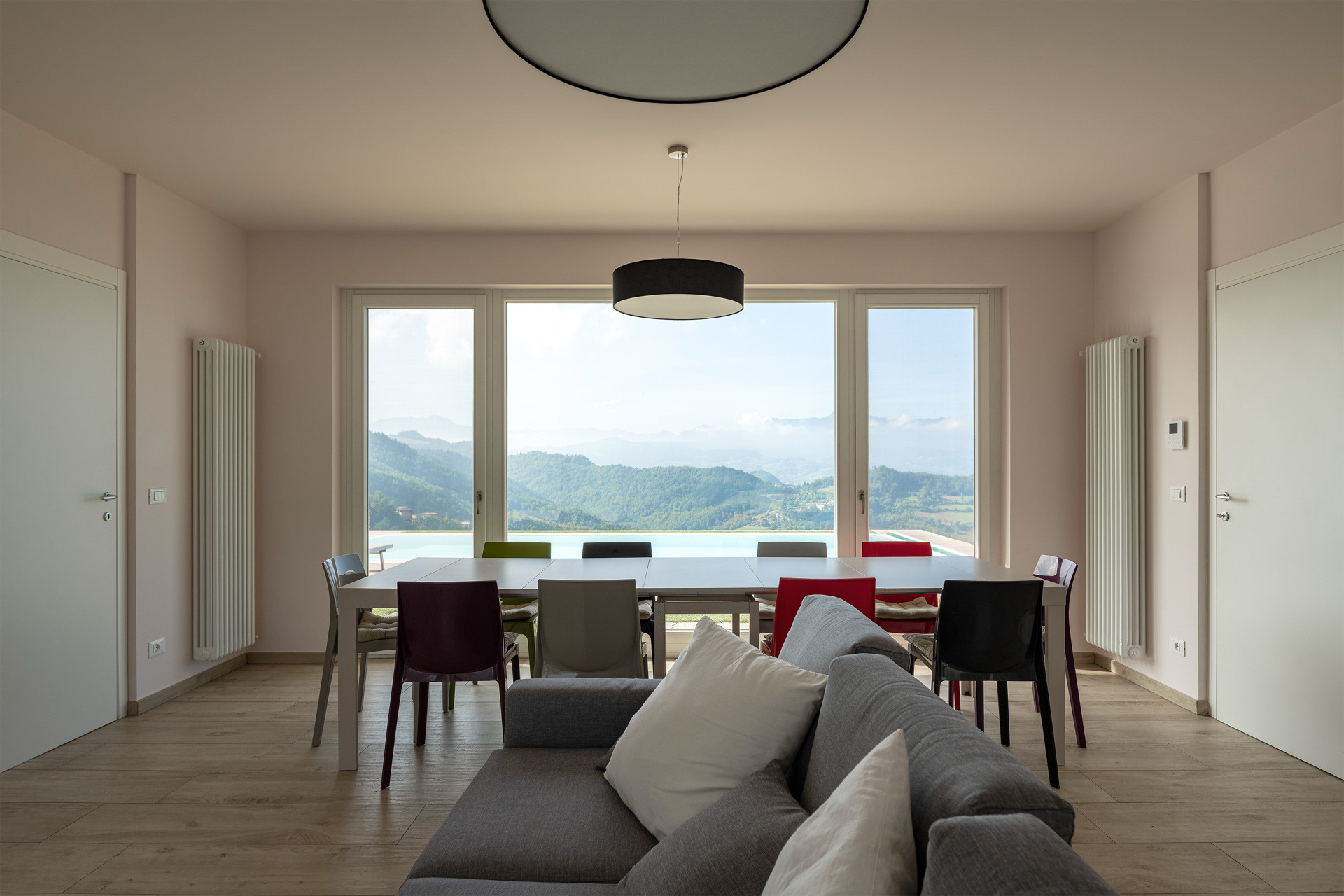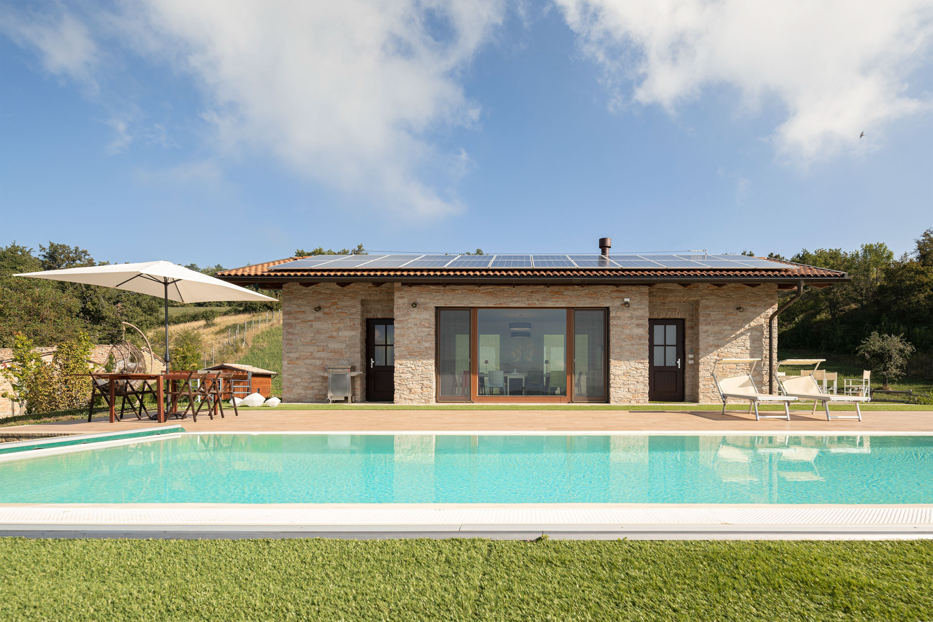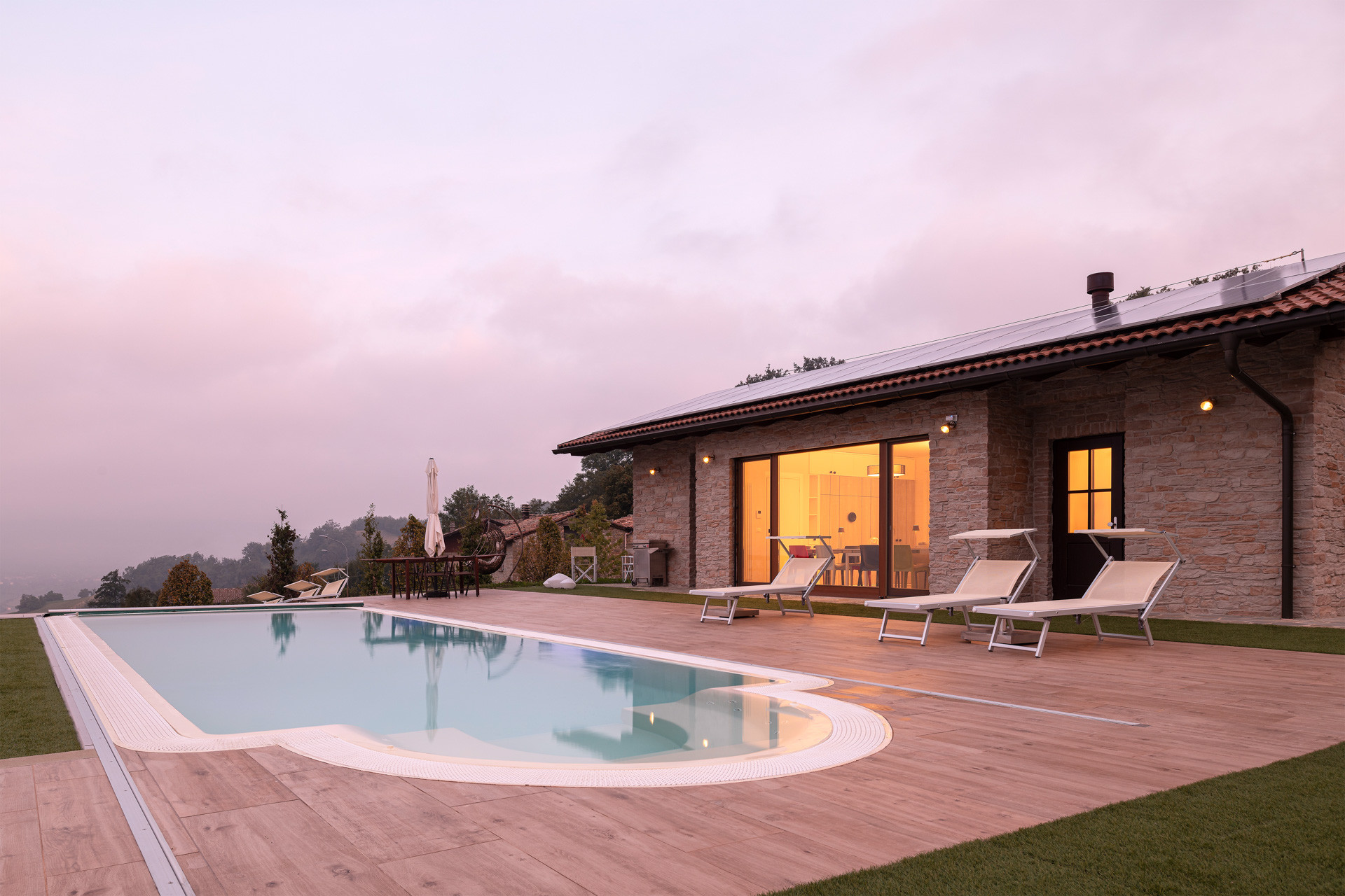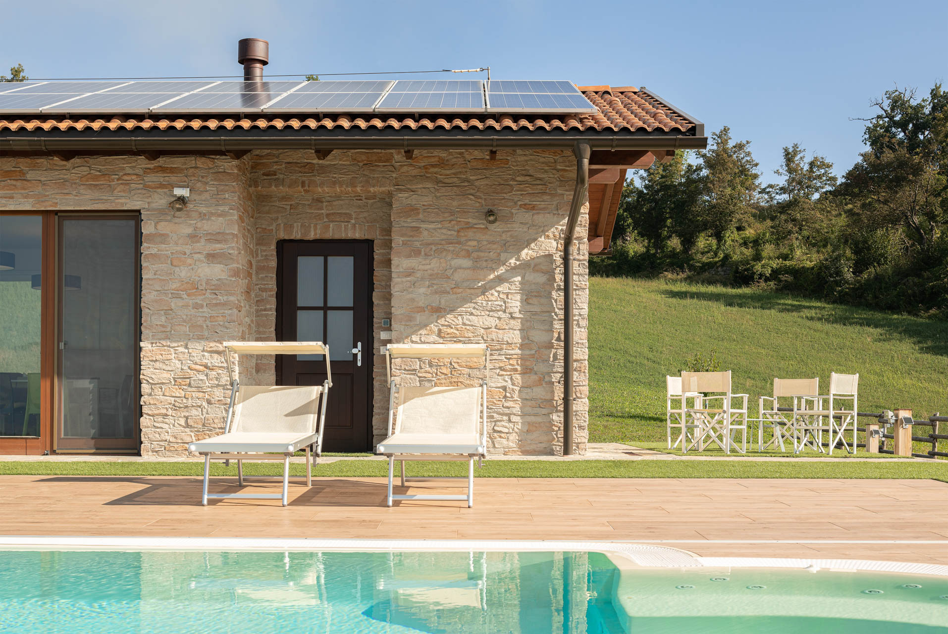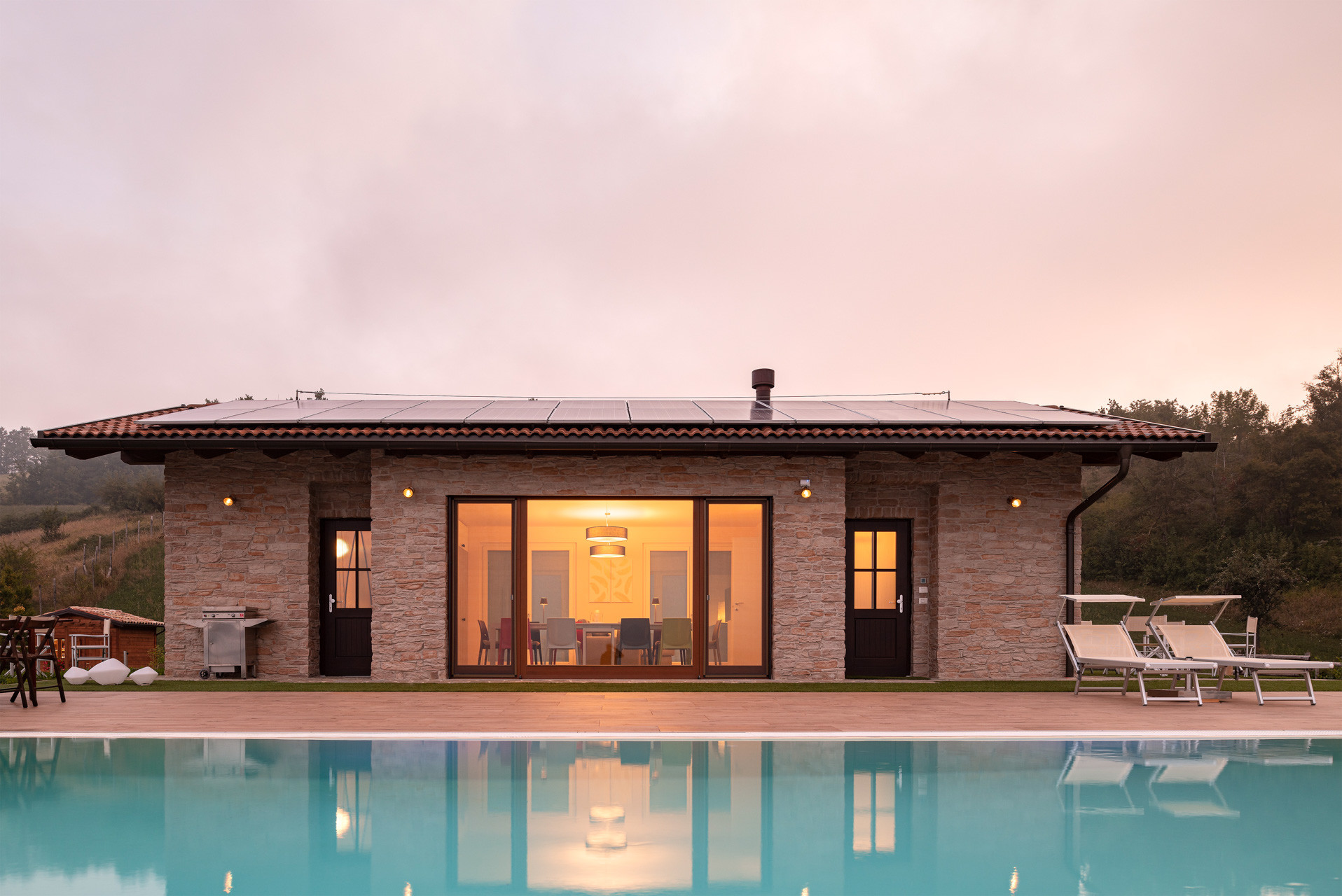 Der Infinity-Pool, der vom einzigen Wohnbereich des kleinen Hauses überblickt wird, vervollständigt und bereichert dieses einfache ländliche Bauwerk. Photovoltaikmodule liefern dem Haus, das auch mit einem Holzofen beheizt wird, Energie, während die Solarthermie für die Erwärmung des Poolwassers genutzt wird.