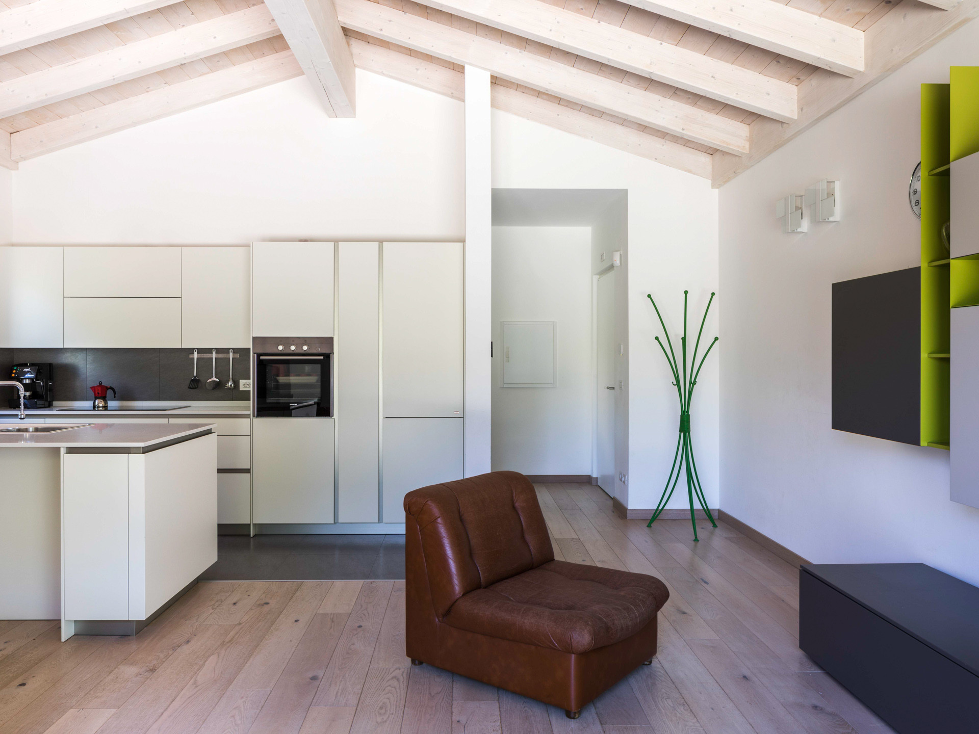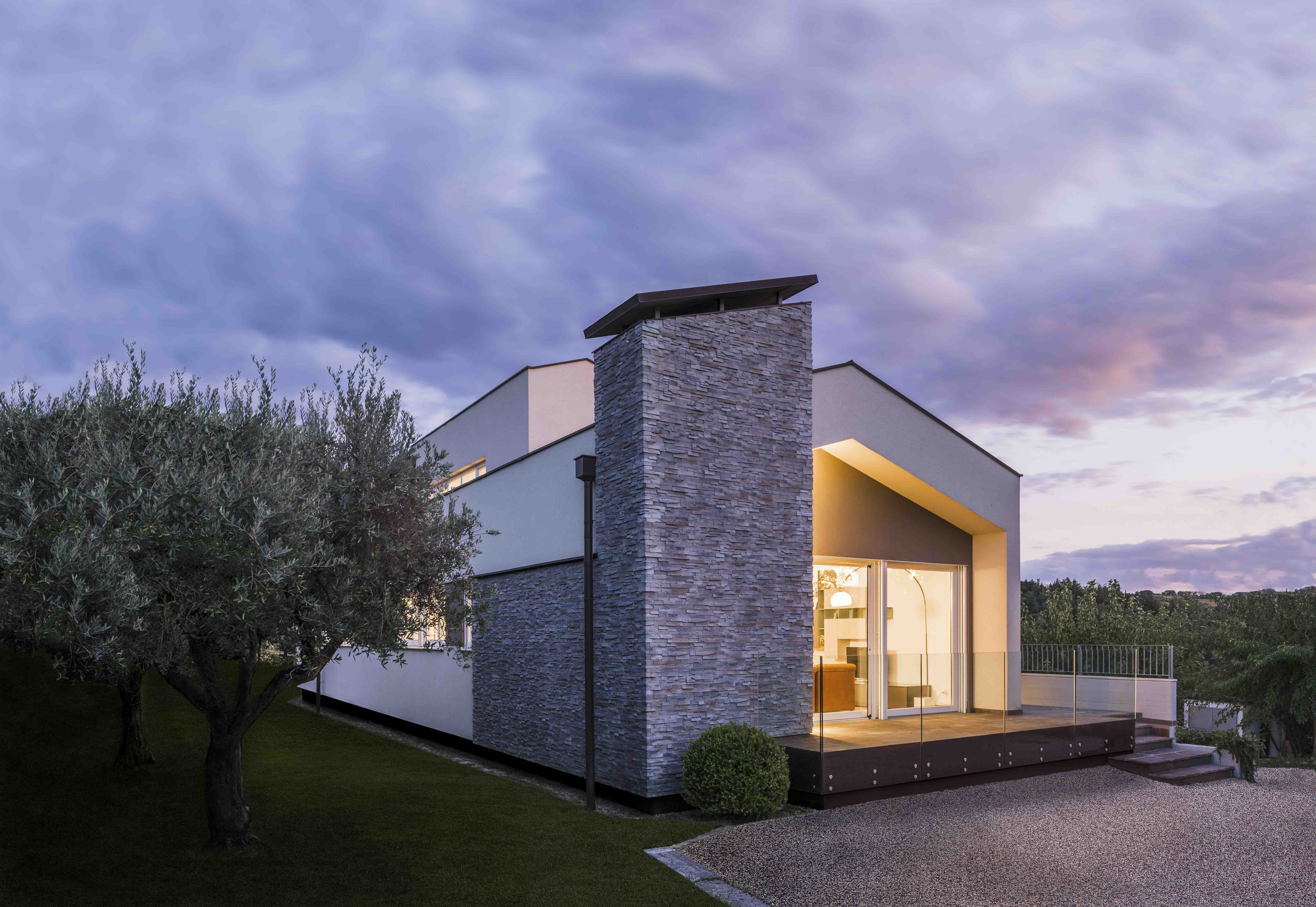 Due to the sloping plot of land, the house was built with a reinforced concrete semi-basement and an underground floor housing the technical and utility rooms and the garage. It also includes a partially overhanging wooden upper floor.