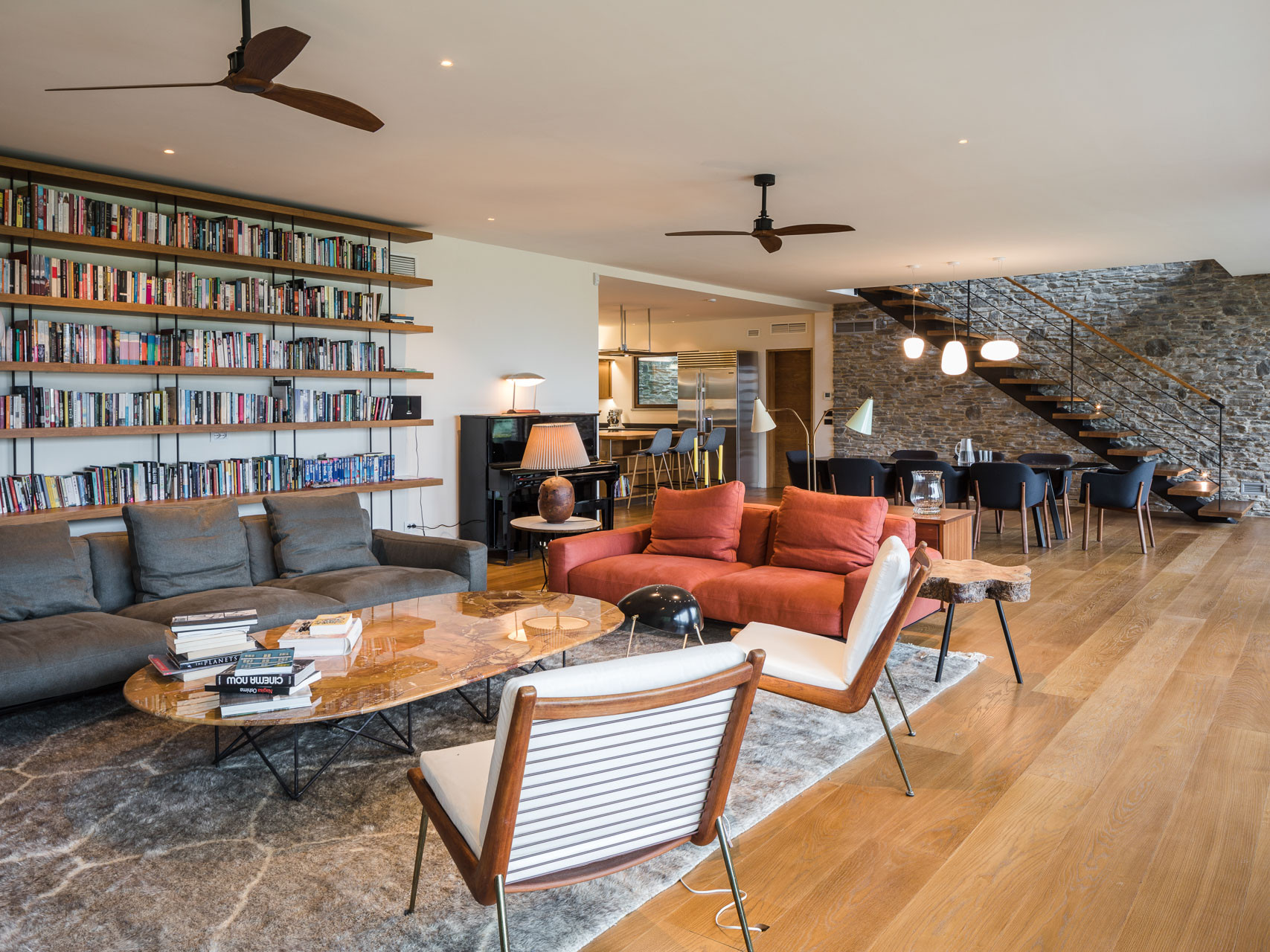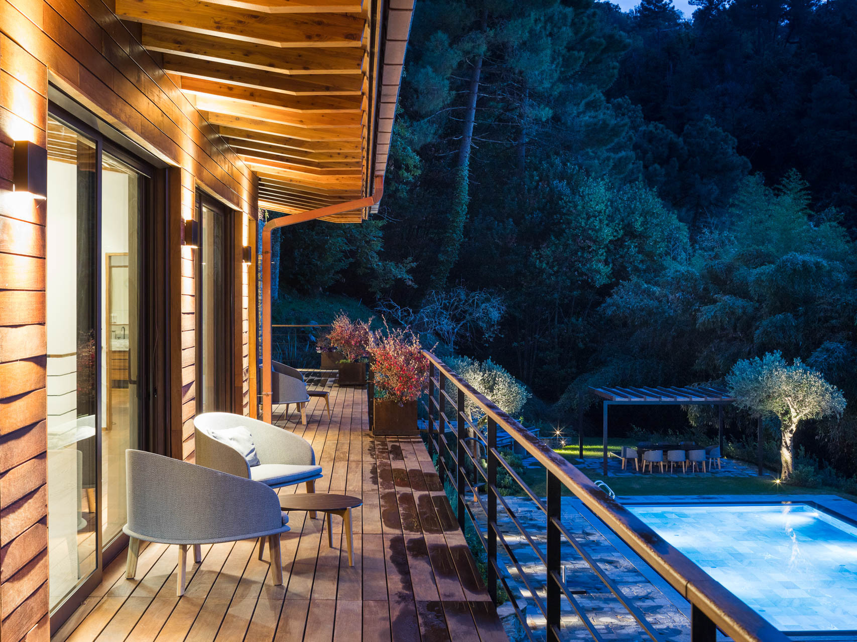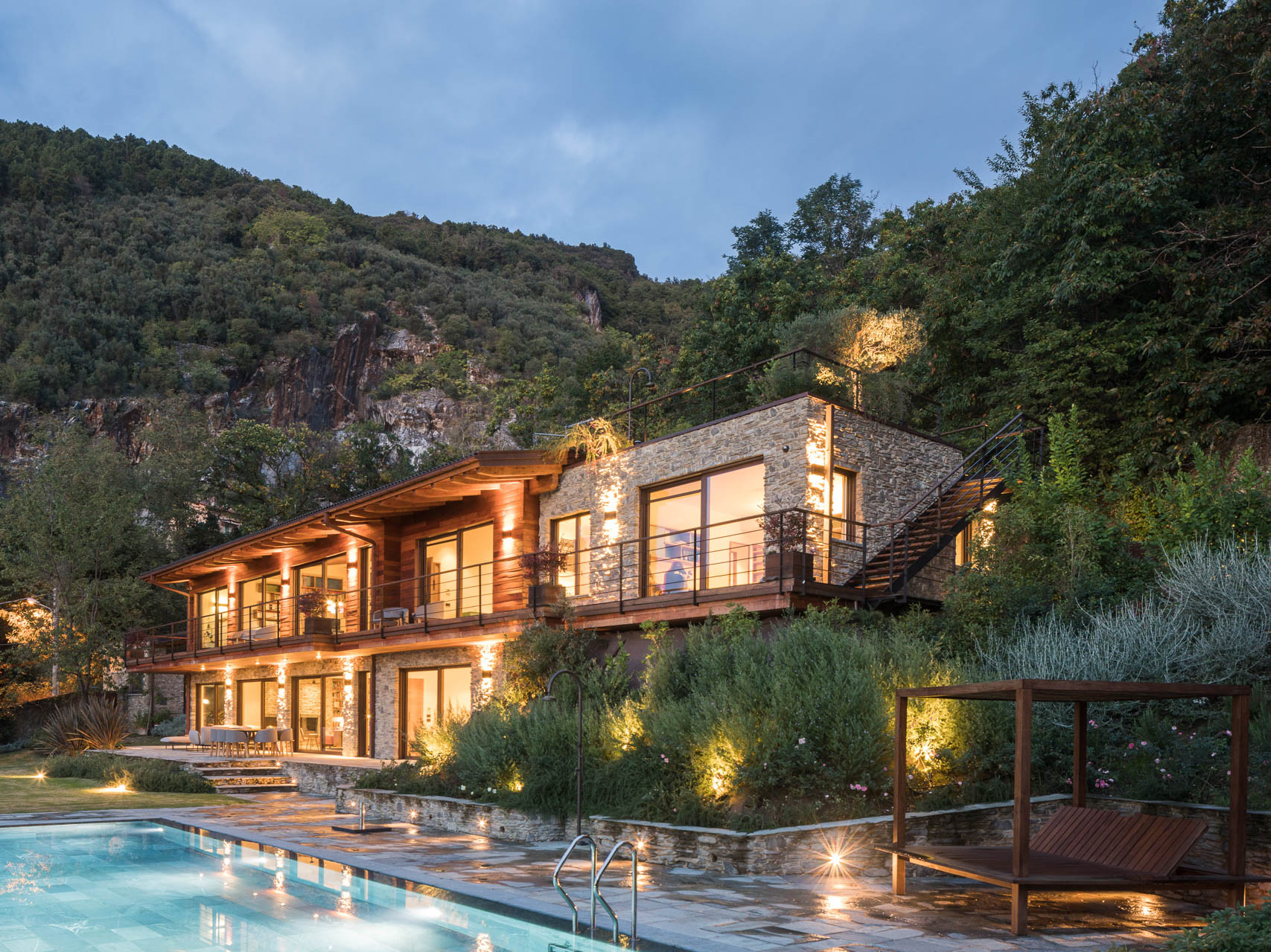 La pierre naturelle évoque les petits murs traditionnels en pierre sèche, le bois et le métal bruni semblent compléter la nature alentour, sans la contaminer, les grandes baies vitrées reflètent le paysage et l’accueillent au sein de cette habitation luxueuse.