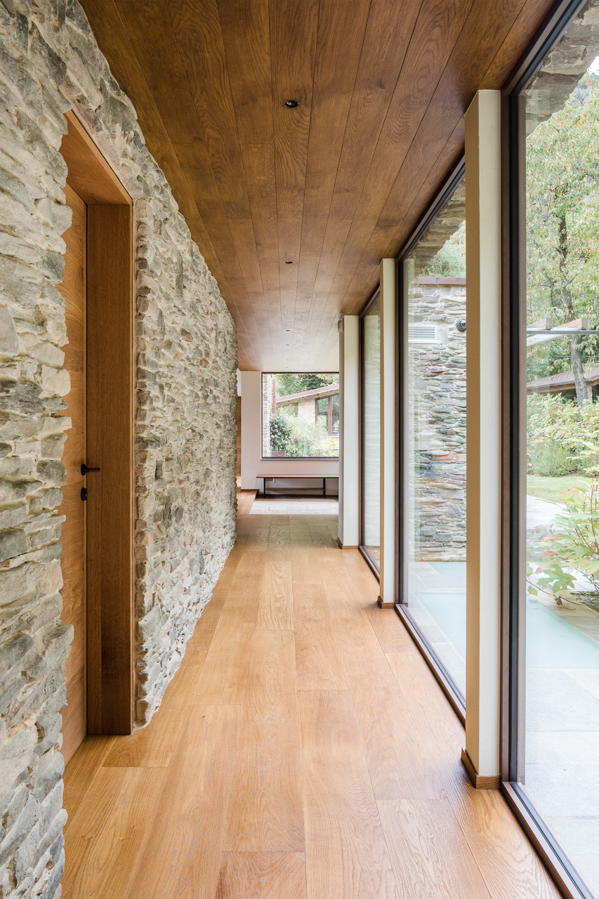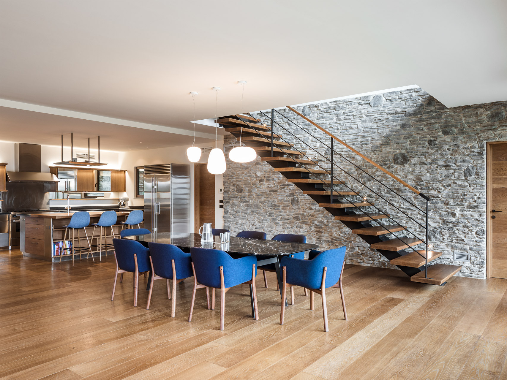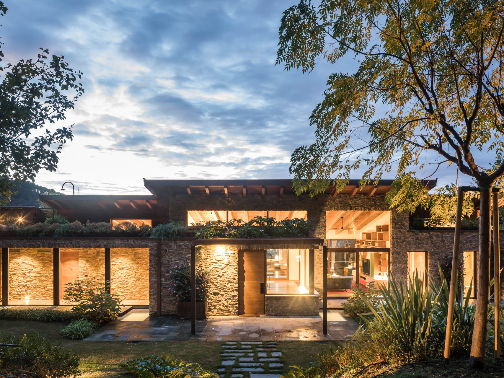La pierre naturelle évoque les petits murs traditionnels en pierre sèche, le bois et le métal bruni semblent compléter la nature alentour, sans la contaminer, les grandes baies vitrées reflètent le paysage et l’accueillent au sein de cette habitation luxueuse.
