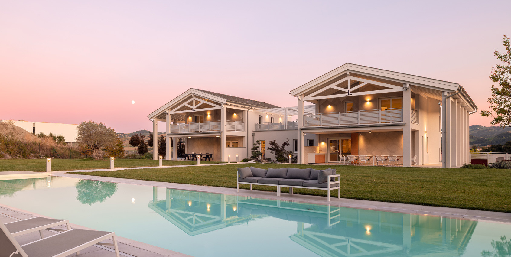 Villa Giulia è una grande bifamiliare simmetrica costruita per essere la casa di due famiglie numerose e affiatate che hanno scelto di condividere gli spazi verdi esterni e la piscina.