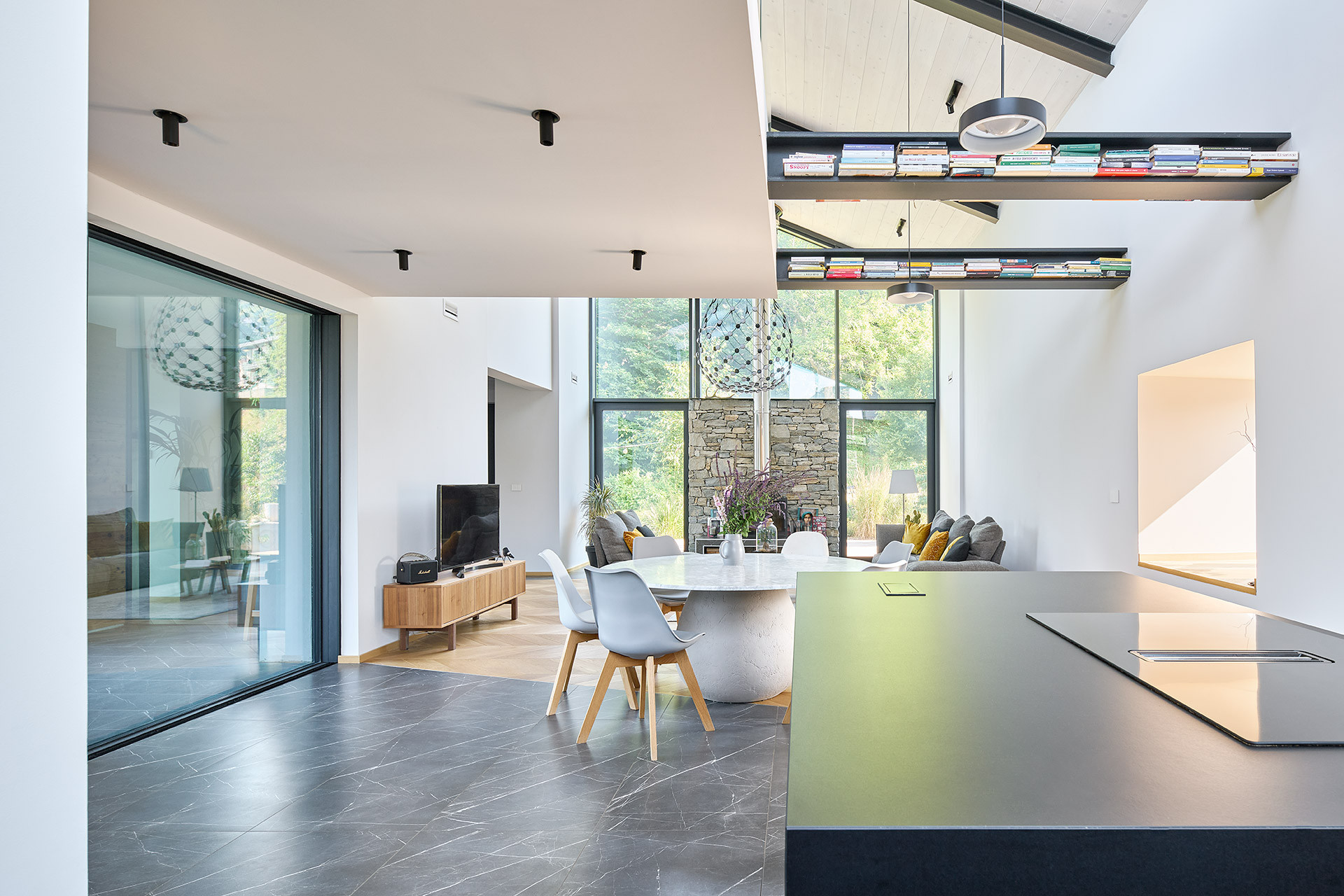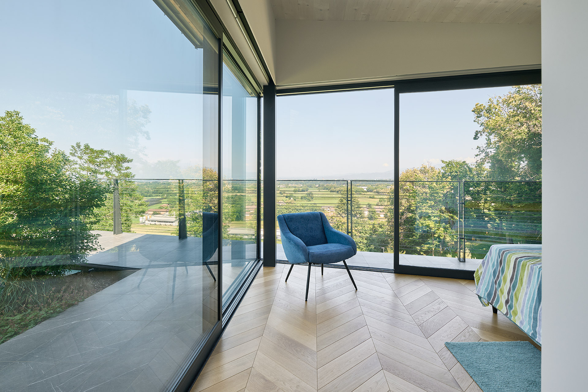 La configurazione planimetrica organizza la casa attorno a una zona giorno centrale ampia e conviviale, pensata come luogo di incontro e condivisione tra cucina, pranzo e soggiorno in un unico ambiente luminoso. Le due ali laterali ospitano invece la zona notte: da un lato la suite padronale, dall’altro le camere dedicate ai figli, garantendo comfort, autonomia e riservatezza. La costruzione in legno assicura elevate prestazioni energetiche, benessere indoor e sostenibilità, rendendo Villa Ulissys un esempio di abitazione moderna capace di unire design, funzionalità e innovazione costruttiva.