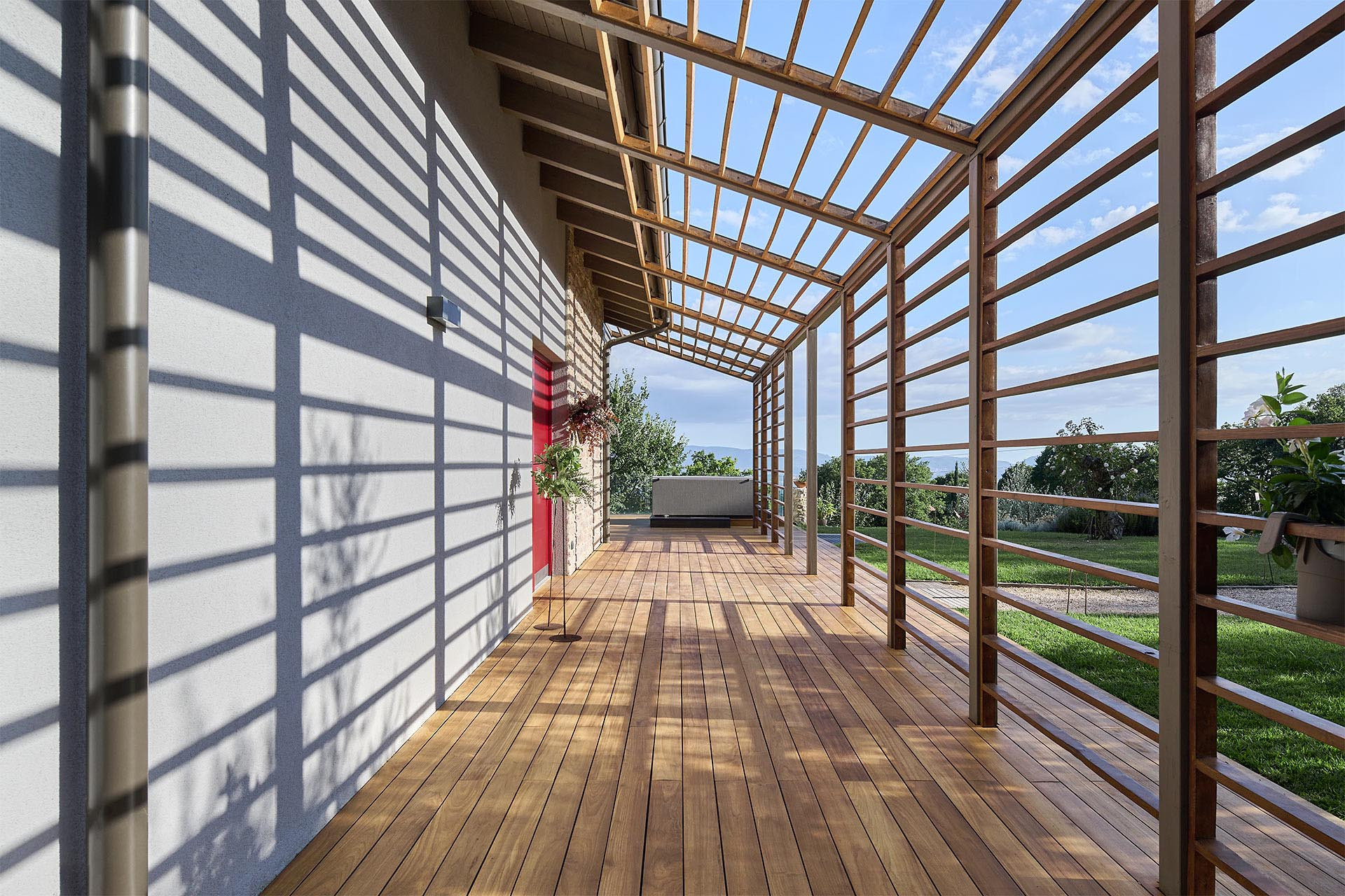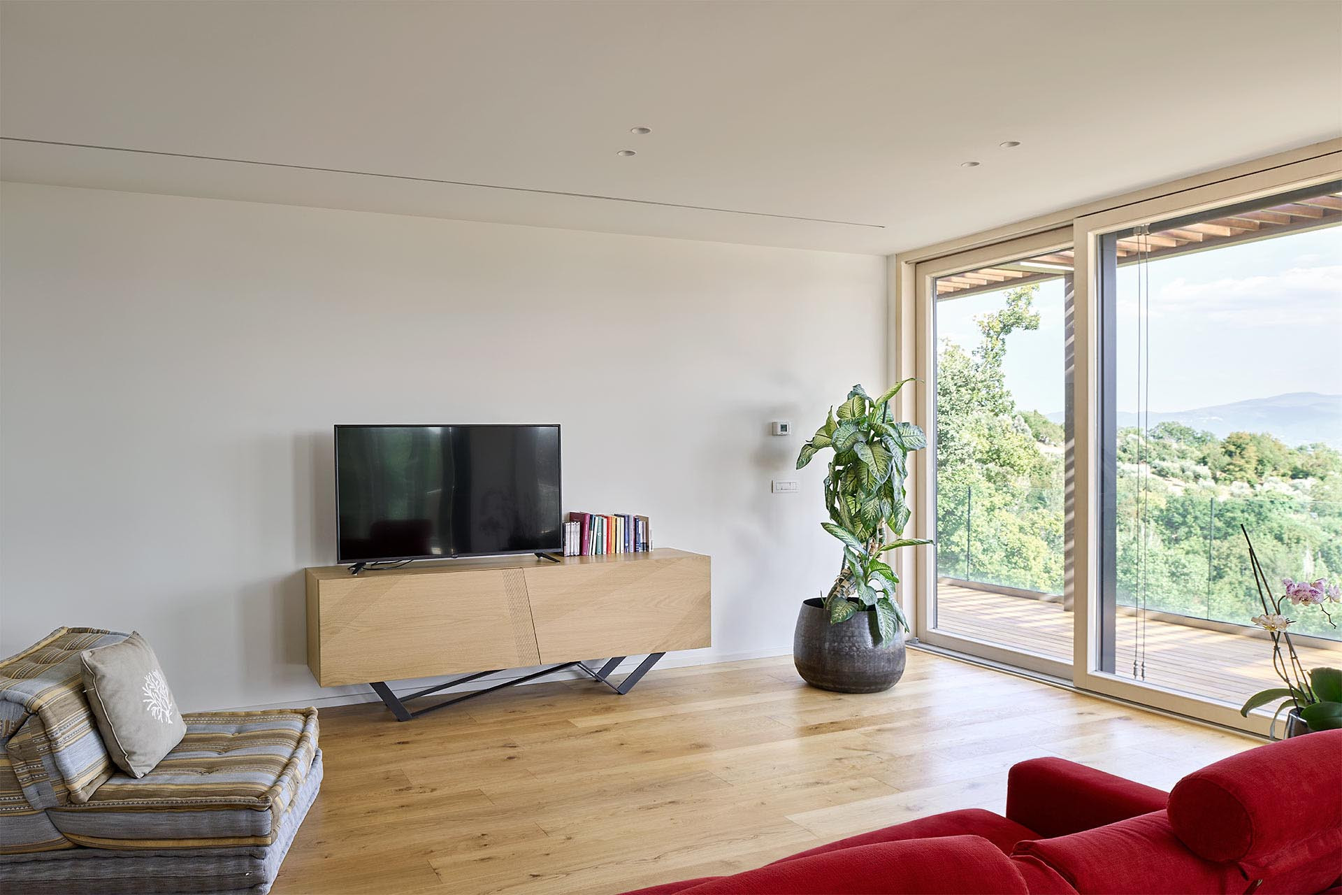 Dalla sua posizione privilegiata, Villa Itaca offre una vista panoramica che abbraccia la valle da sud-est a sud-ovest. Come una visiera che protegge lo sguardo, la casa si adatta all'ambiente circostante, modulando ombra e luce attraverso brise soleil studiati con precisione.