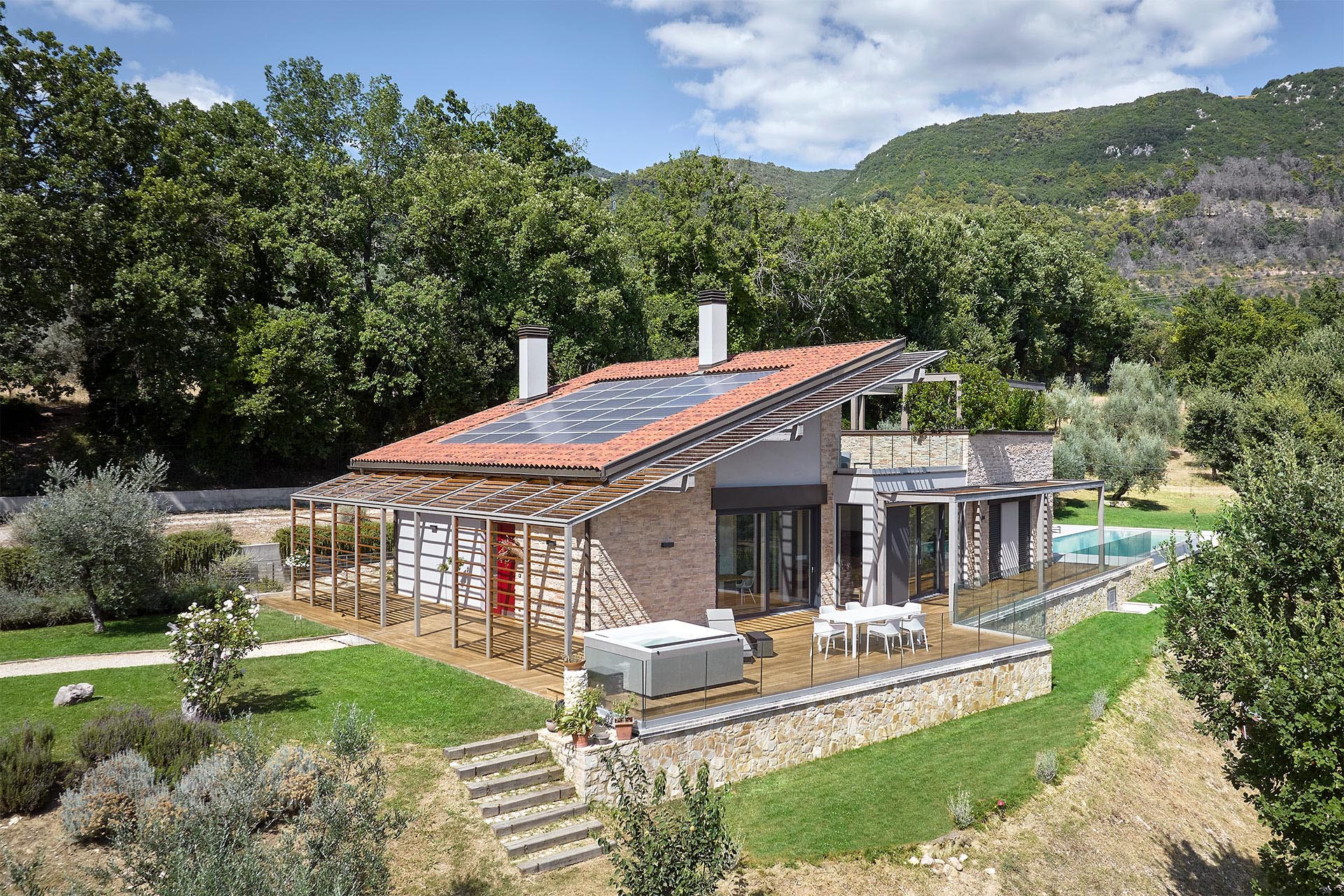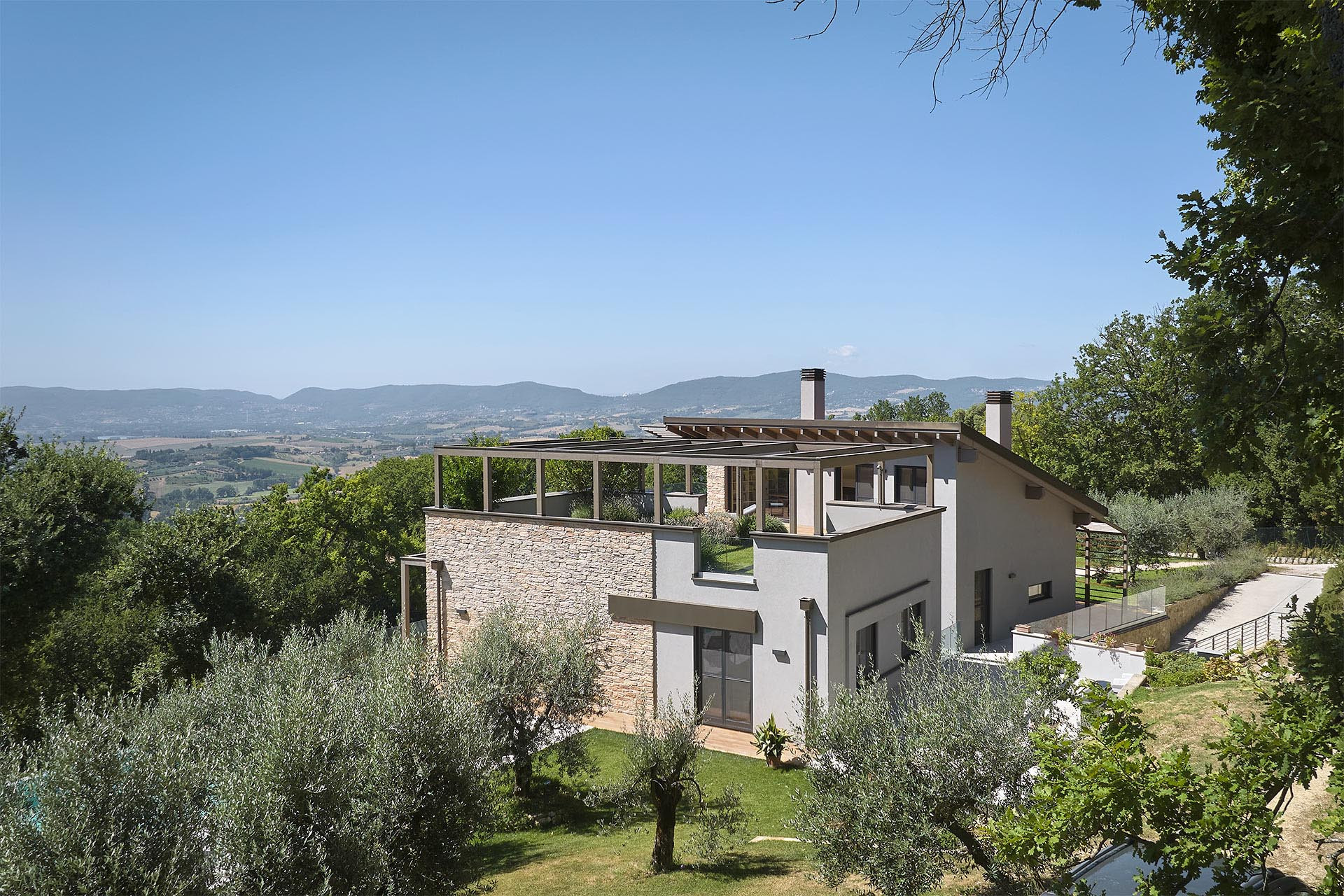 Immagina un pendio collinare baciato dal sole, dove si staglia con eleganza Villa Itaca, un gioiello architettonico che abbraccia l'essenza del paesaggio umbro. L'obbligo di rispettare vincoli paesaggistici e tipologici ha ispirato un design che si fonde armoniosamente con la natura circostante.
