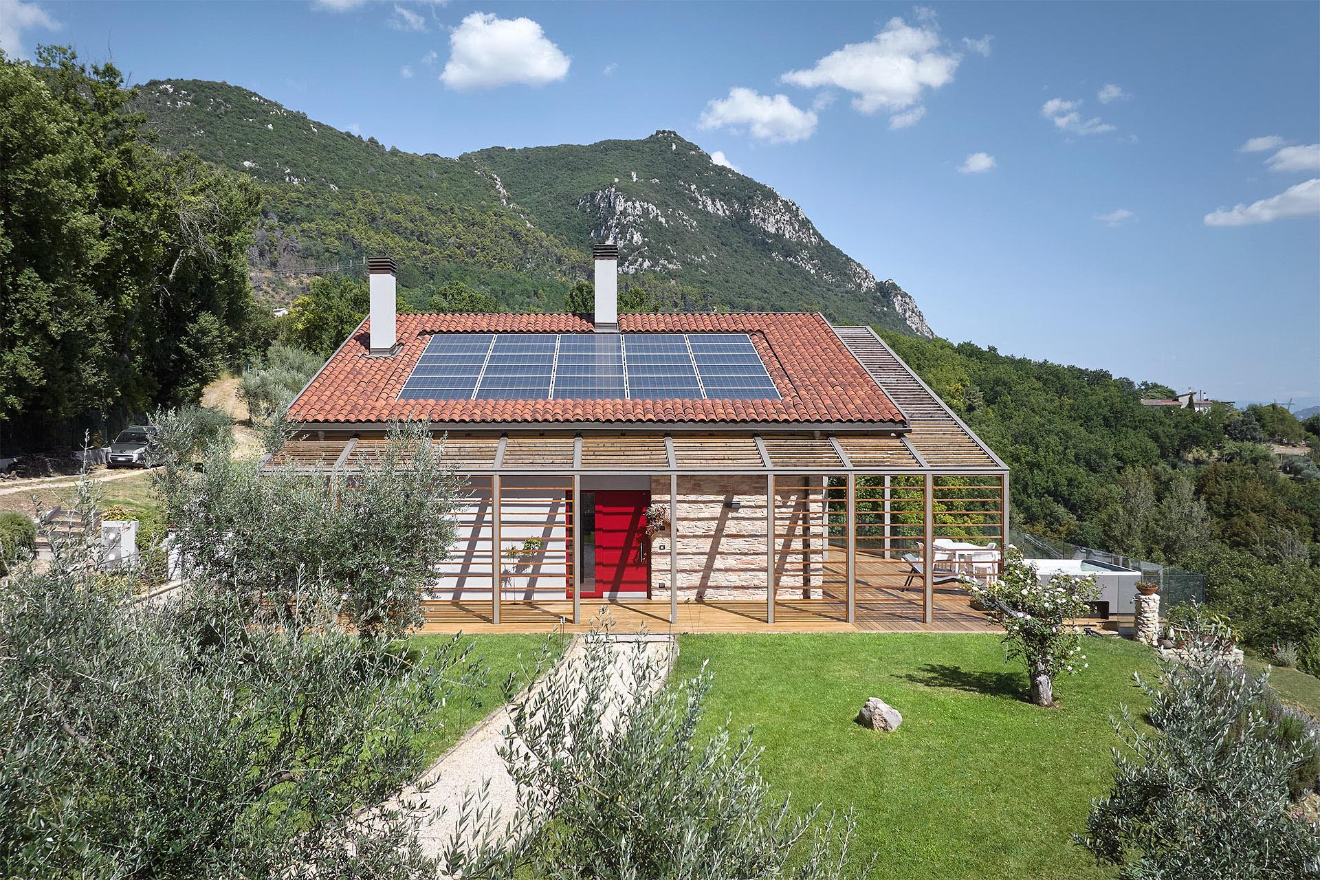 L'attenzione all'ambiente va oltre l'estetica: l'edificio quasi autonomo a livello energetico si integra perfettamente nel paesaggio, con soluzioni tecnologiche che minimizzano l'impatto ambientale. La combinazione di materiali tradizionali come la pietra e le travi in legno conferisce alla casa un'identità unica, rispettando la tipologia locale.