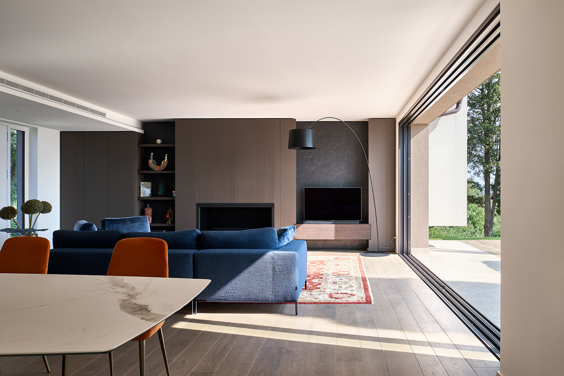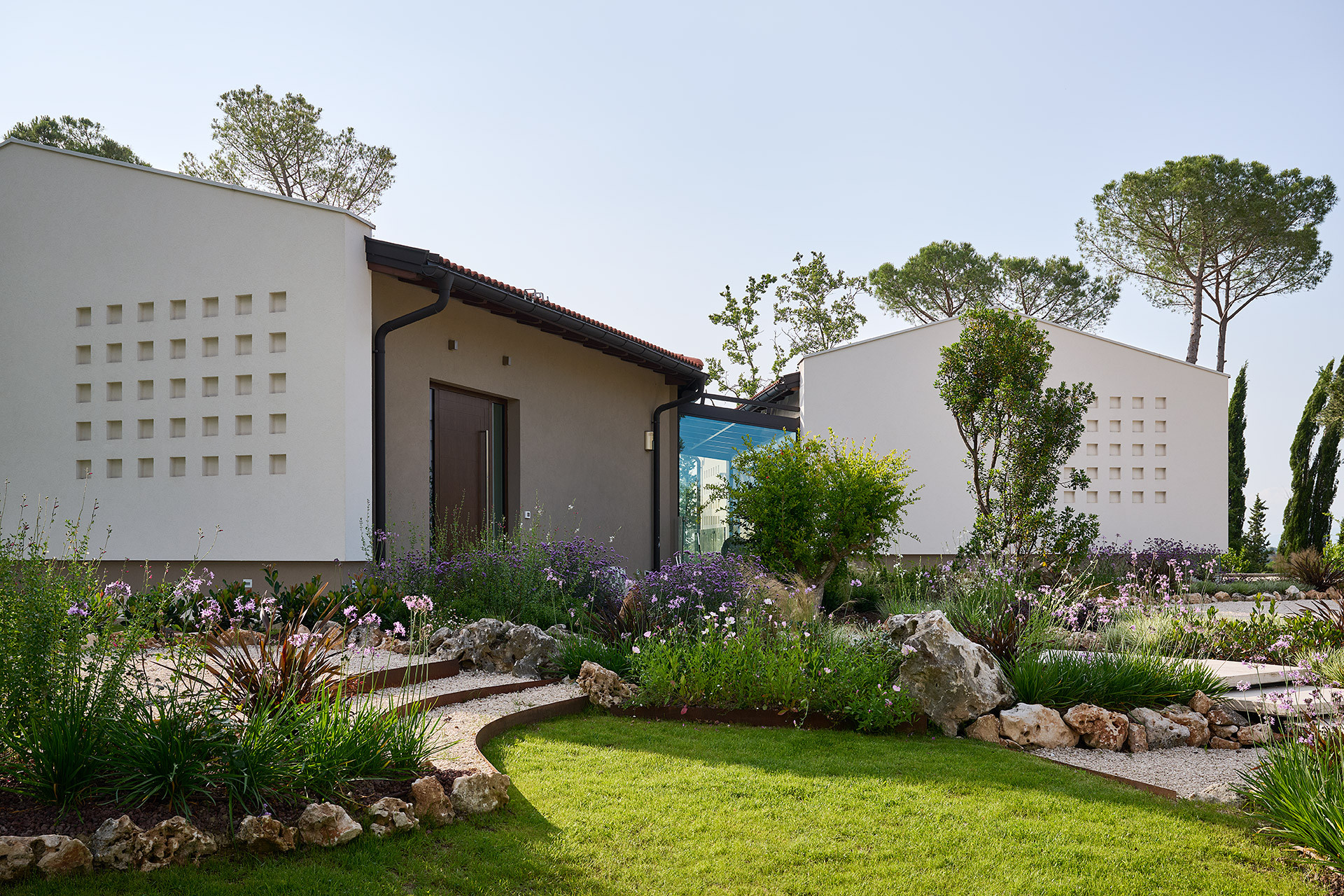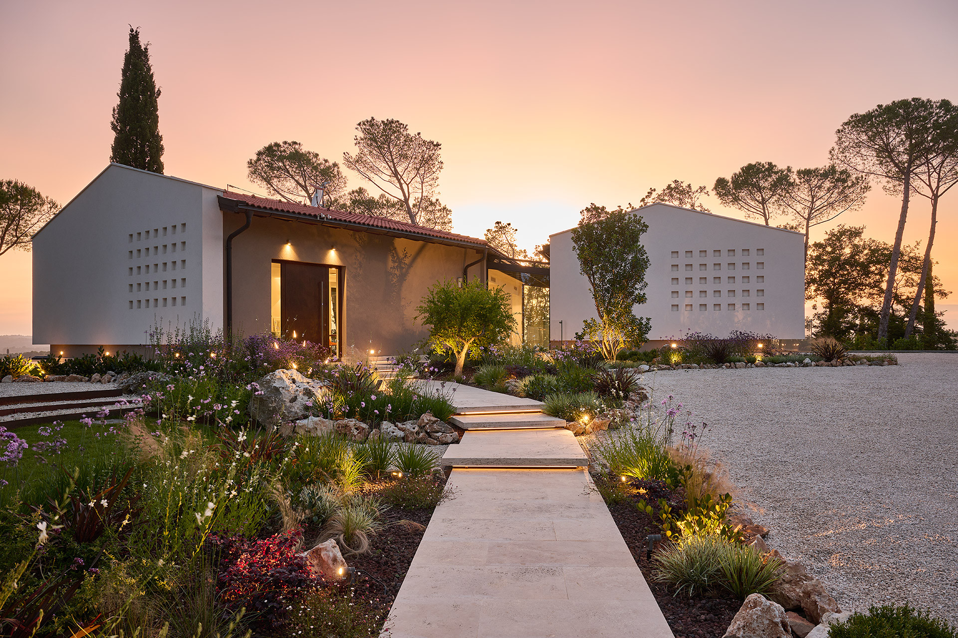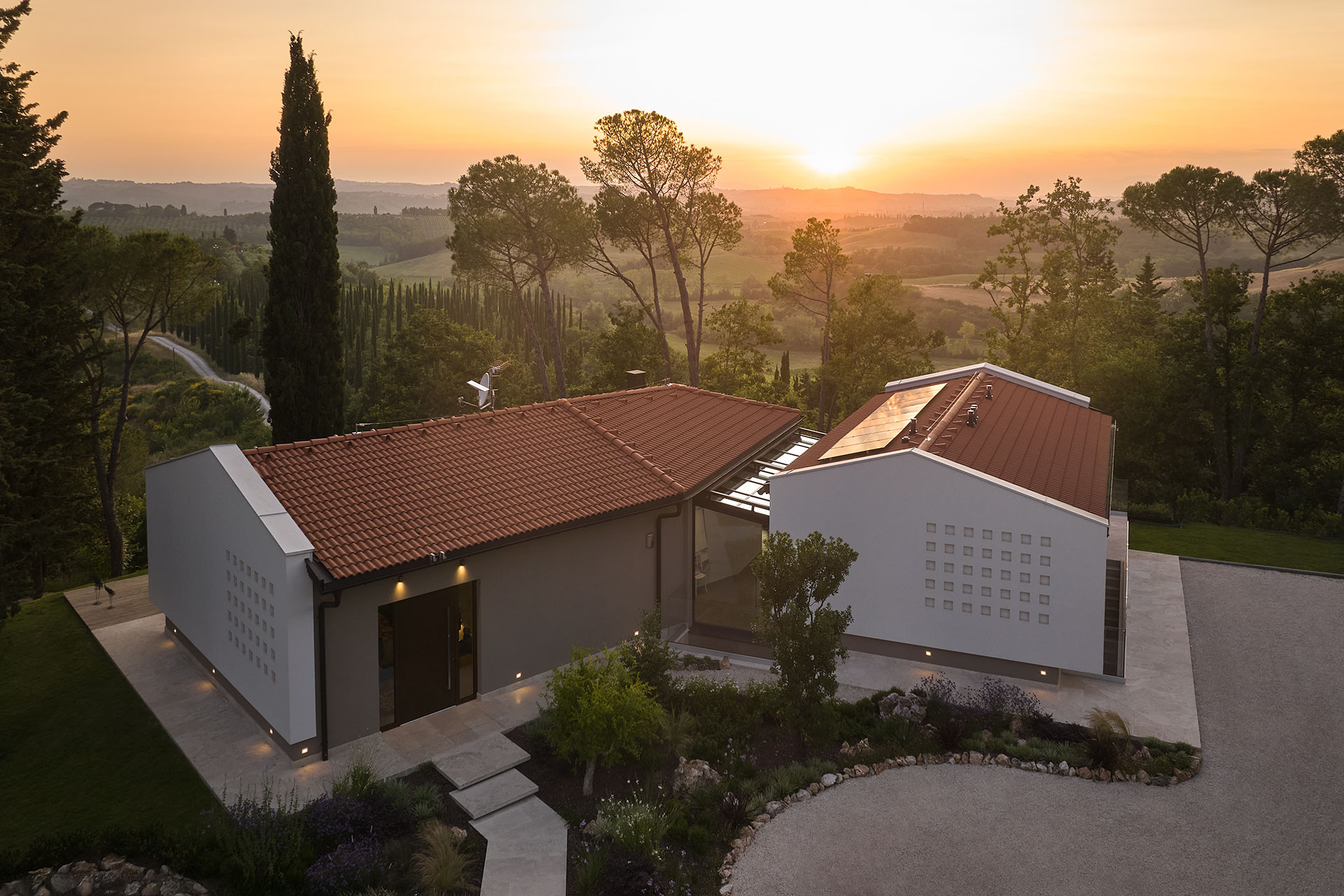La configurazione volumetrica sfalsata risponde sia ai vincoli del sito sia alla volontà progettuale di distinguere gli spazi dedicati alla convivialità da quelli più intimi della zona notte. Un elemento vetrato di collegamento attraversa l’abitazione creando continuità visiva e percettiva con l’esterno, mentre i prospetti reinterpretano l’archetipo della casa rurale toscana attraverso linee contemporanee e materiali naturali. La tecnologia prefabbricata in legno garantisce elevate prestazioni energetiche, comfort termo-igrometrico e rapidità costruttiva, rendendo questa abitazione un modello di casa sostenibile a Firenze. L’involucro ad alta efficienza contribuisce alla riduzione dei consumi energetici e assicura benessere abitativo durante tutto l’anno, confermando i vantaggi delle case prefabbricate in legno come soluzione evoluta per l’abitare contemporaneo.