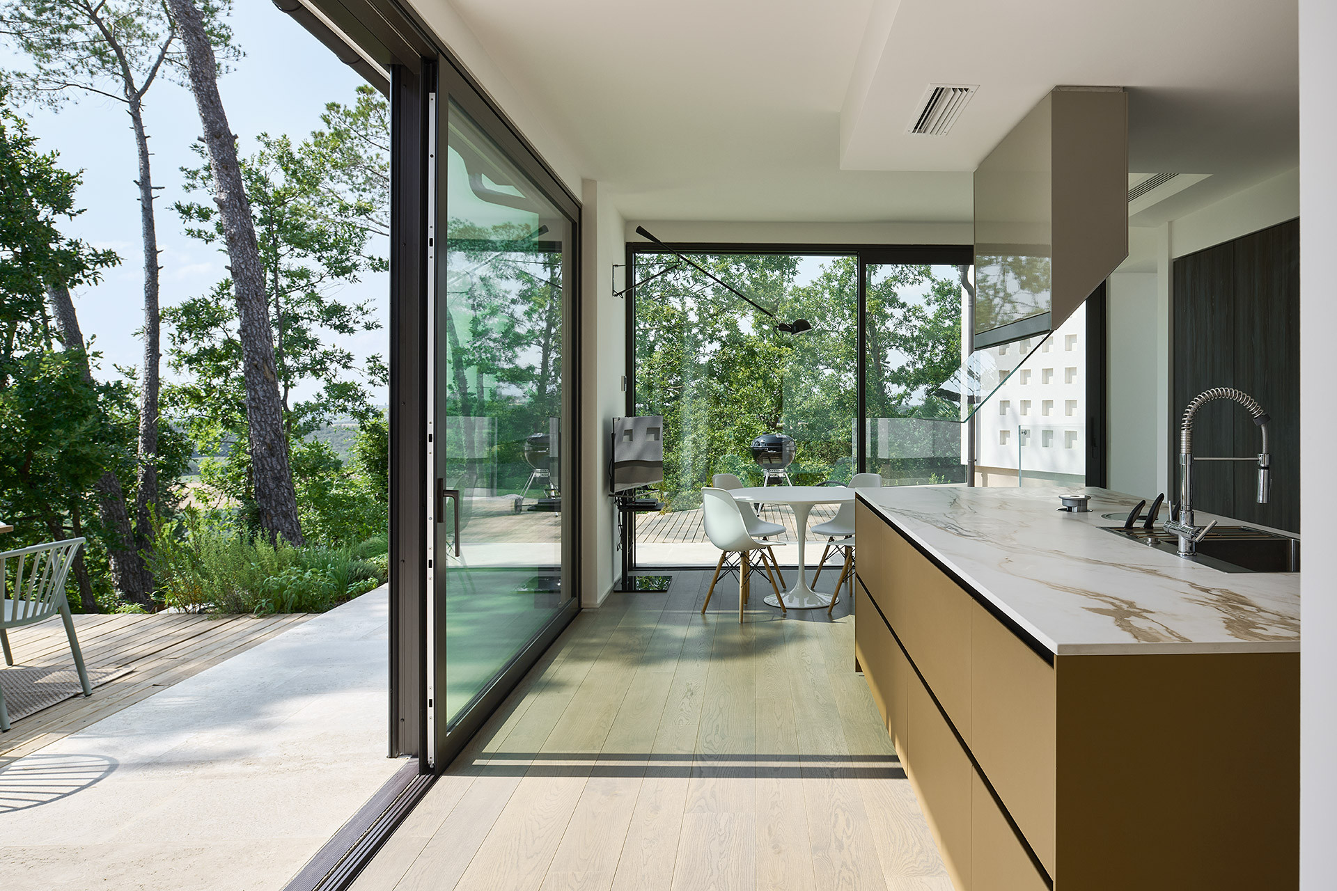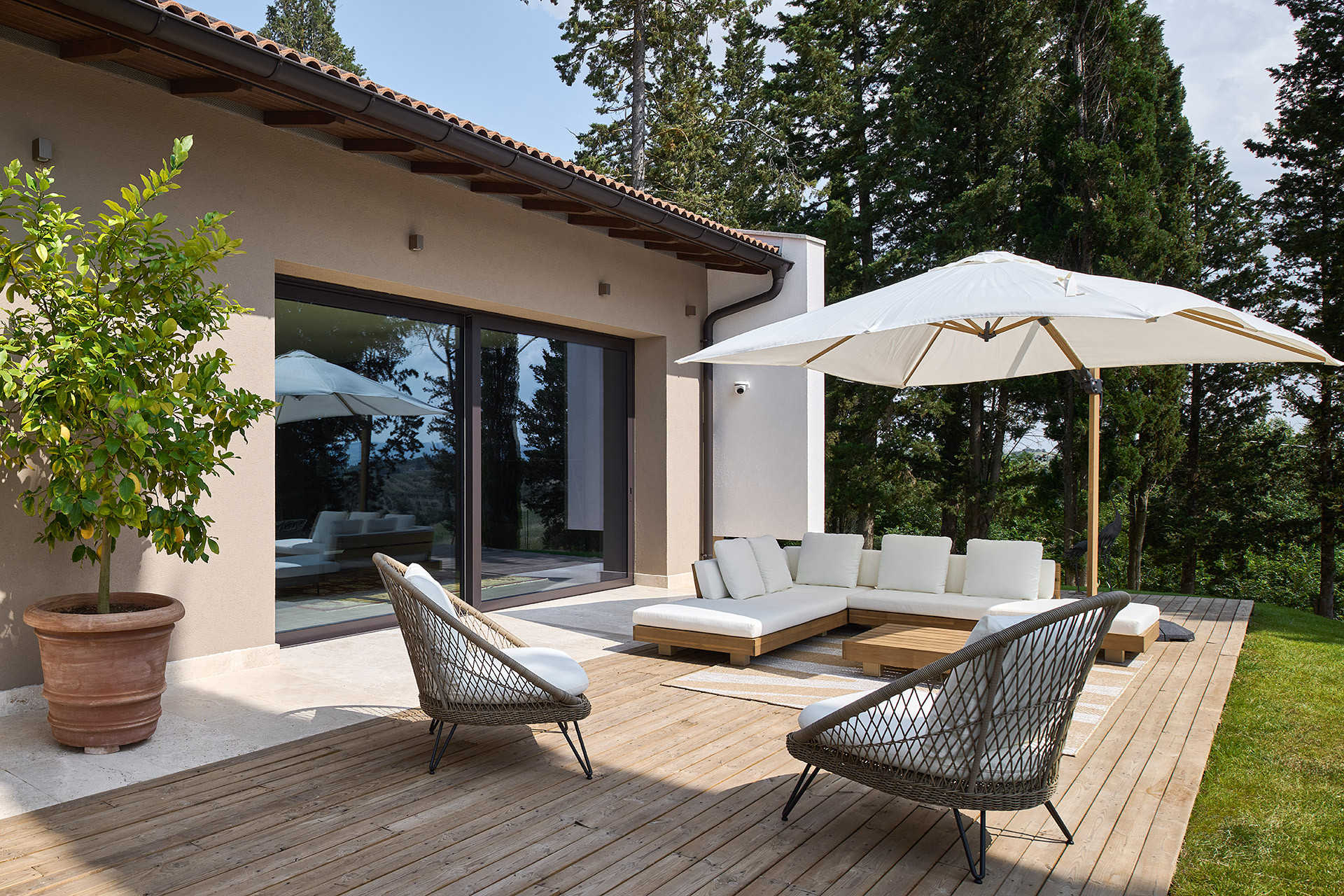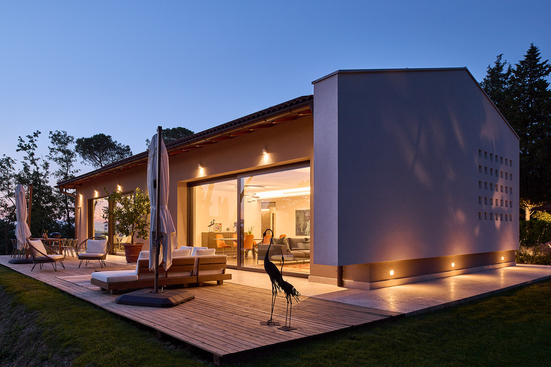 Immersa nel paesaggio collinare toscano, la casa in legno unifamiliare di Poggialina, realizzata da Wolf Haus, rappresenta un esempio di abitazione contemporanea progettata per integrarsi armoniosamente con il territorio. Il progetto nasce dall’attenzione verso il rapporto tra architettura e natura, traducendo le caratteristiche del luogo in scelte compositive precise: grandi superfici vetrate orientate verso il panorama, volumi essenziali e un dialogo costante tra spazi interni ed esterni. La distribuzione degli ambienti privilegia la zona giorno aperta e luminosa, pensata come fulcro della vita domestica e come naturale estensione del giardino e del paesaggio circostante.