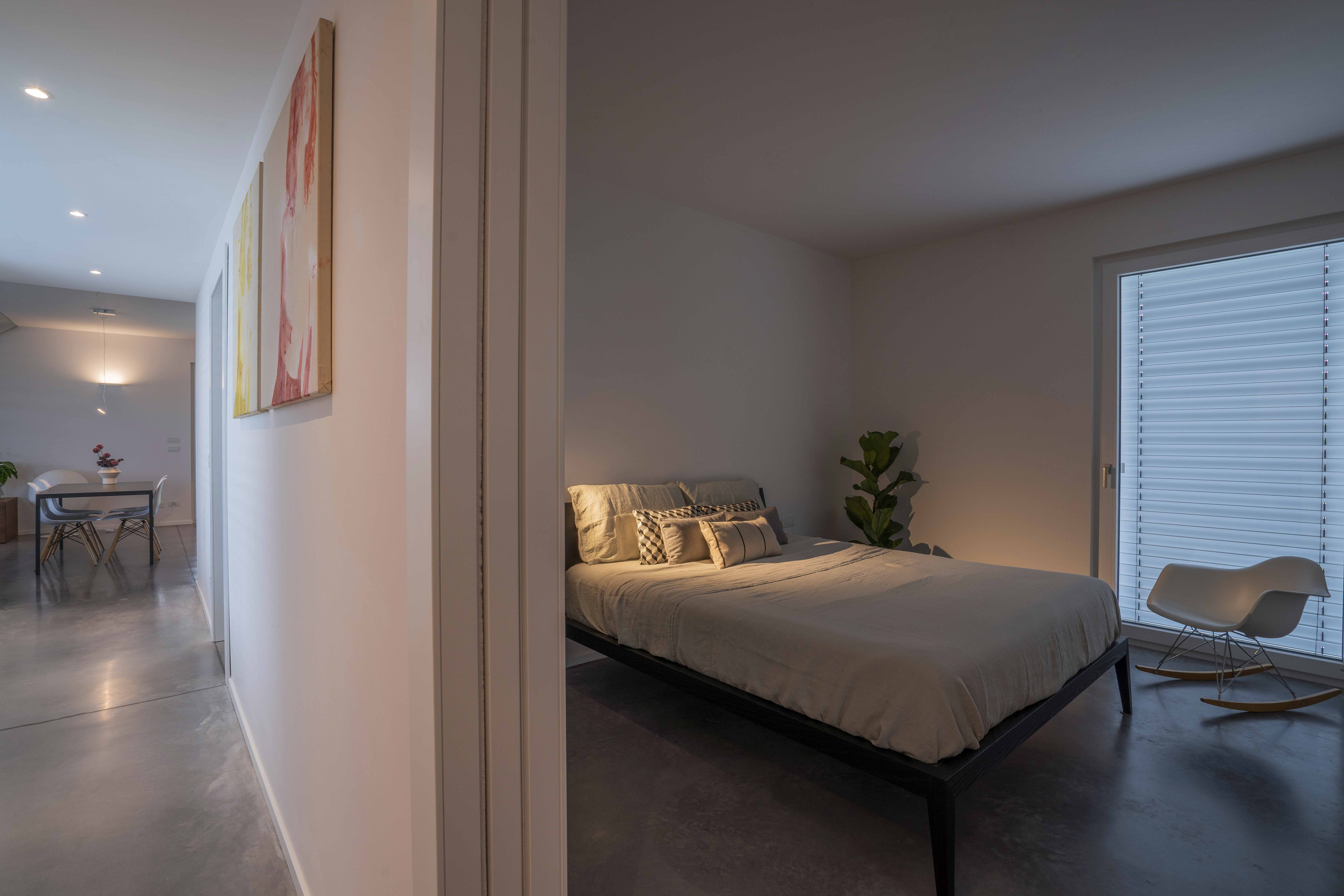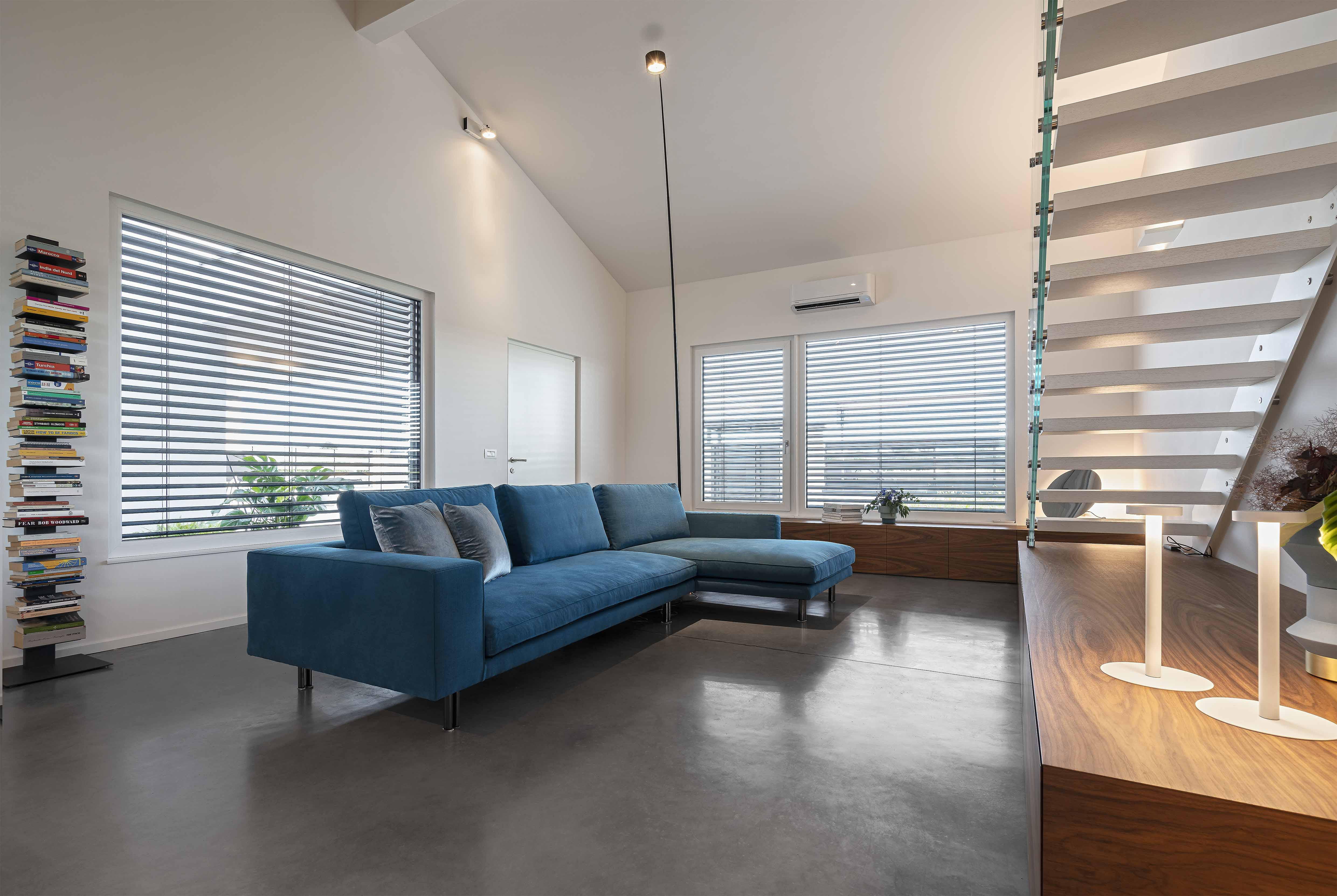 La disposizione degli spazi interni è stata studiata per sfruttare al meglio la luce naturale e l’irraggiamento solare, mantenendo una costante relazione con l’ambiente naturale circostante attraverso ampie vetrate oscurate da frangisole. Le finiture interne sono contemporanee: pareti intonacate di bianco e pavimento in resina grigia riveste tutti gli ambienti.