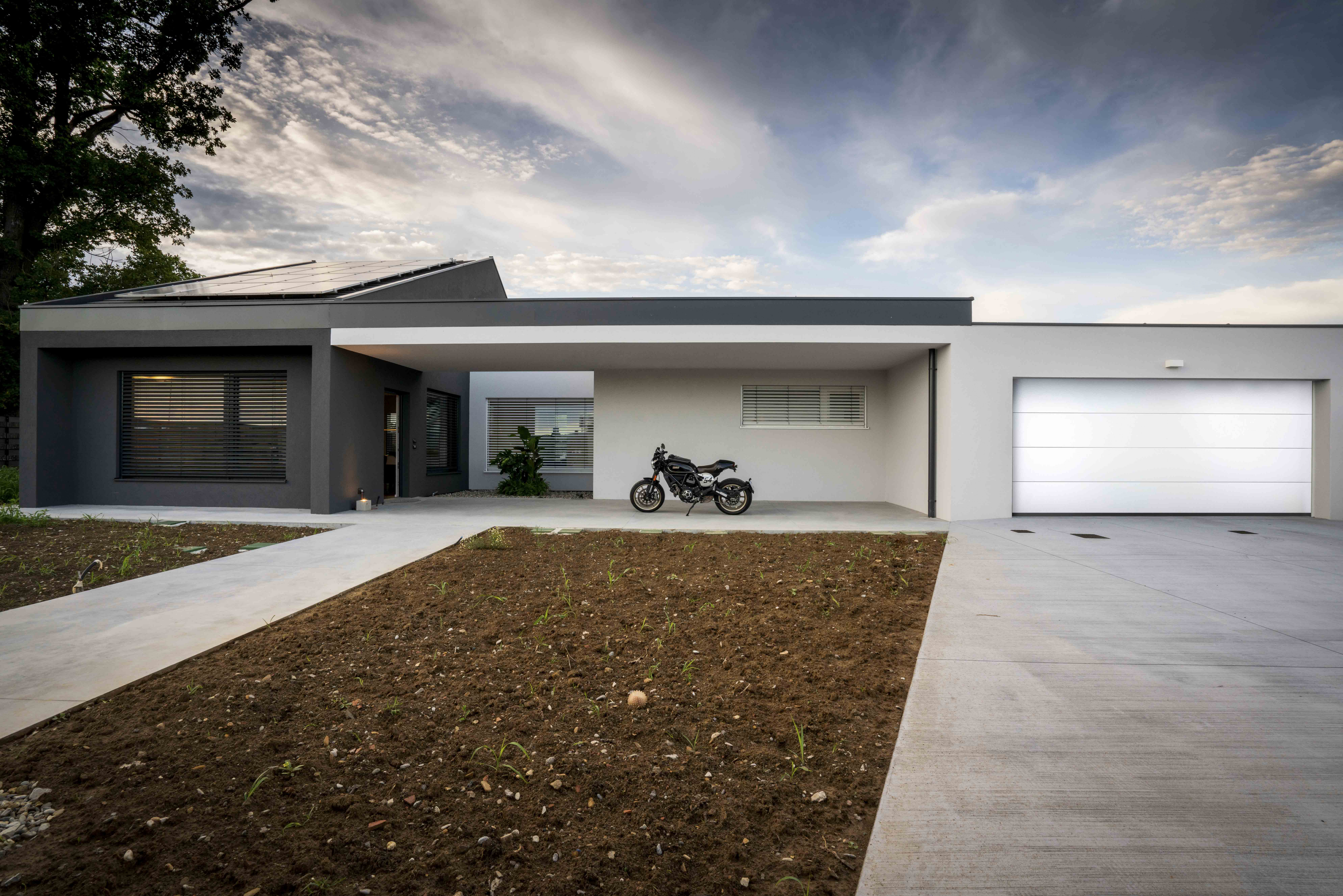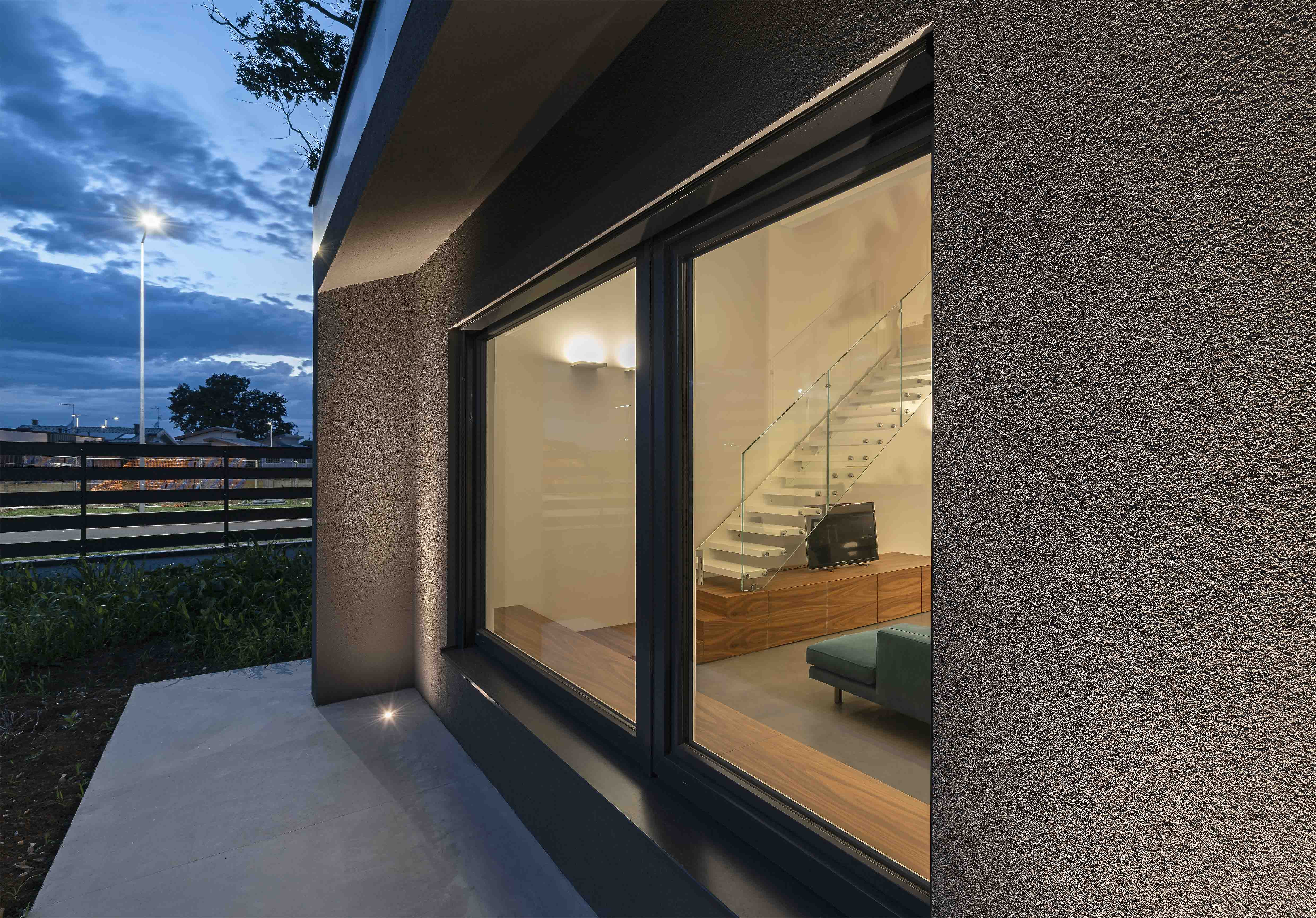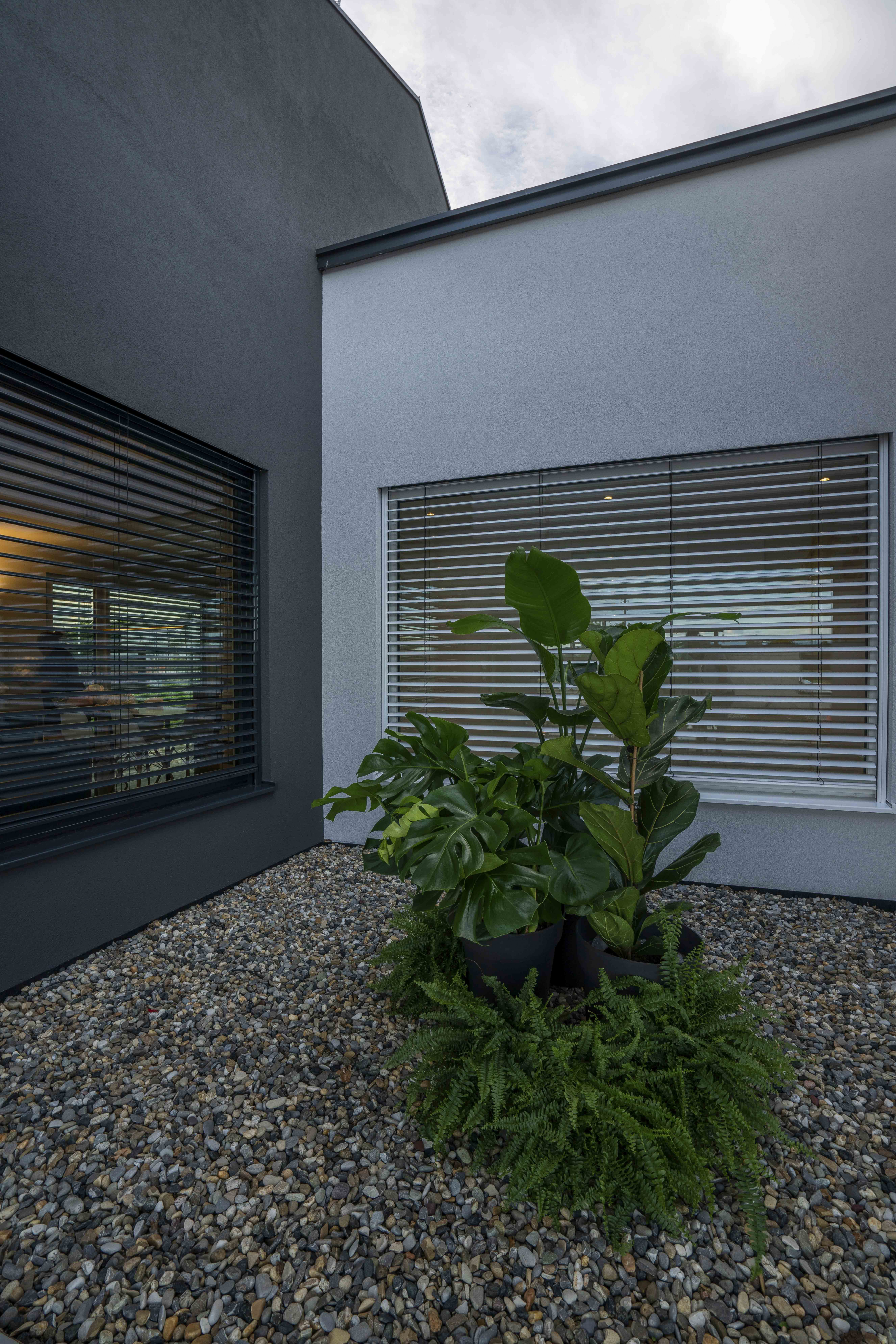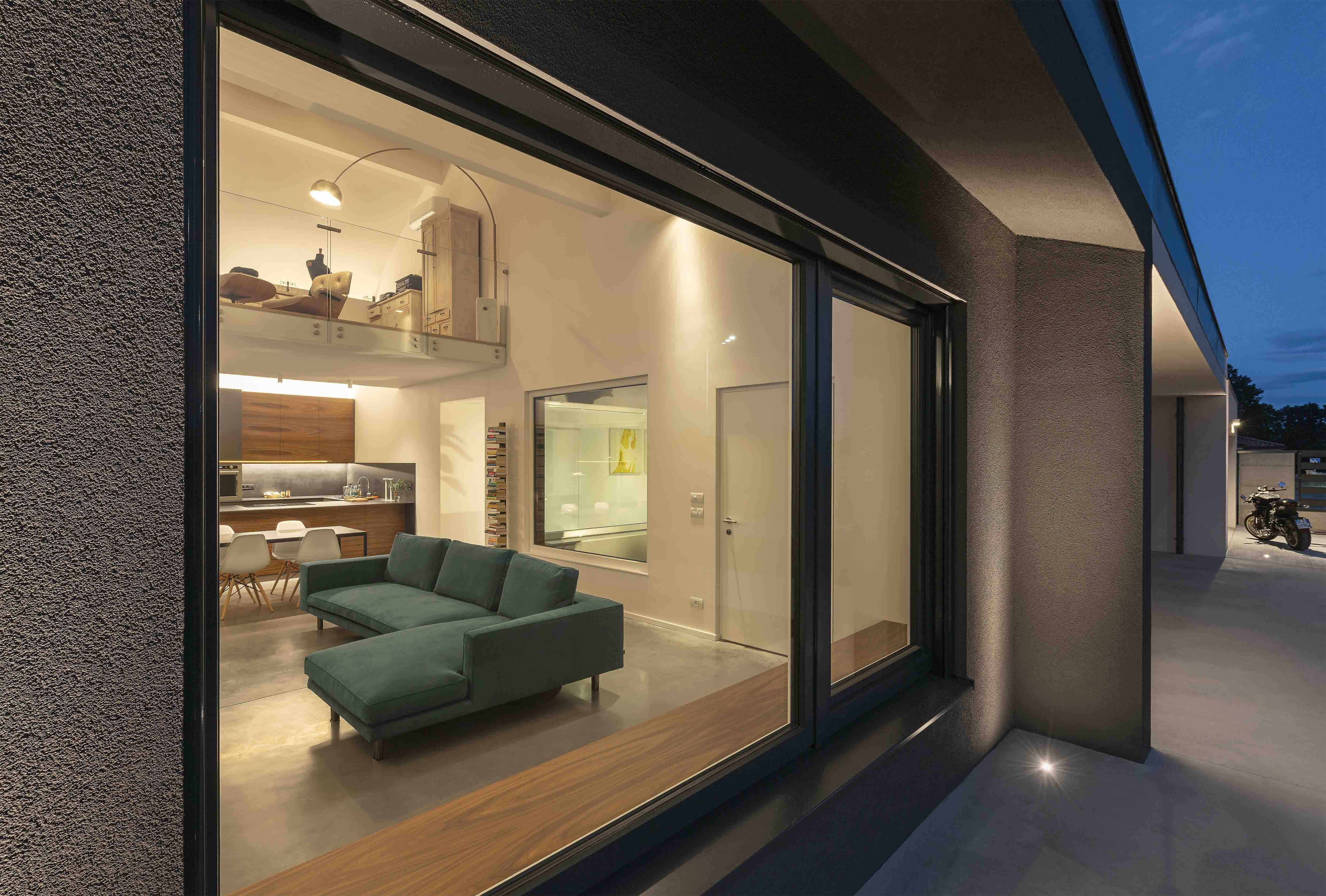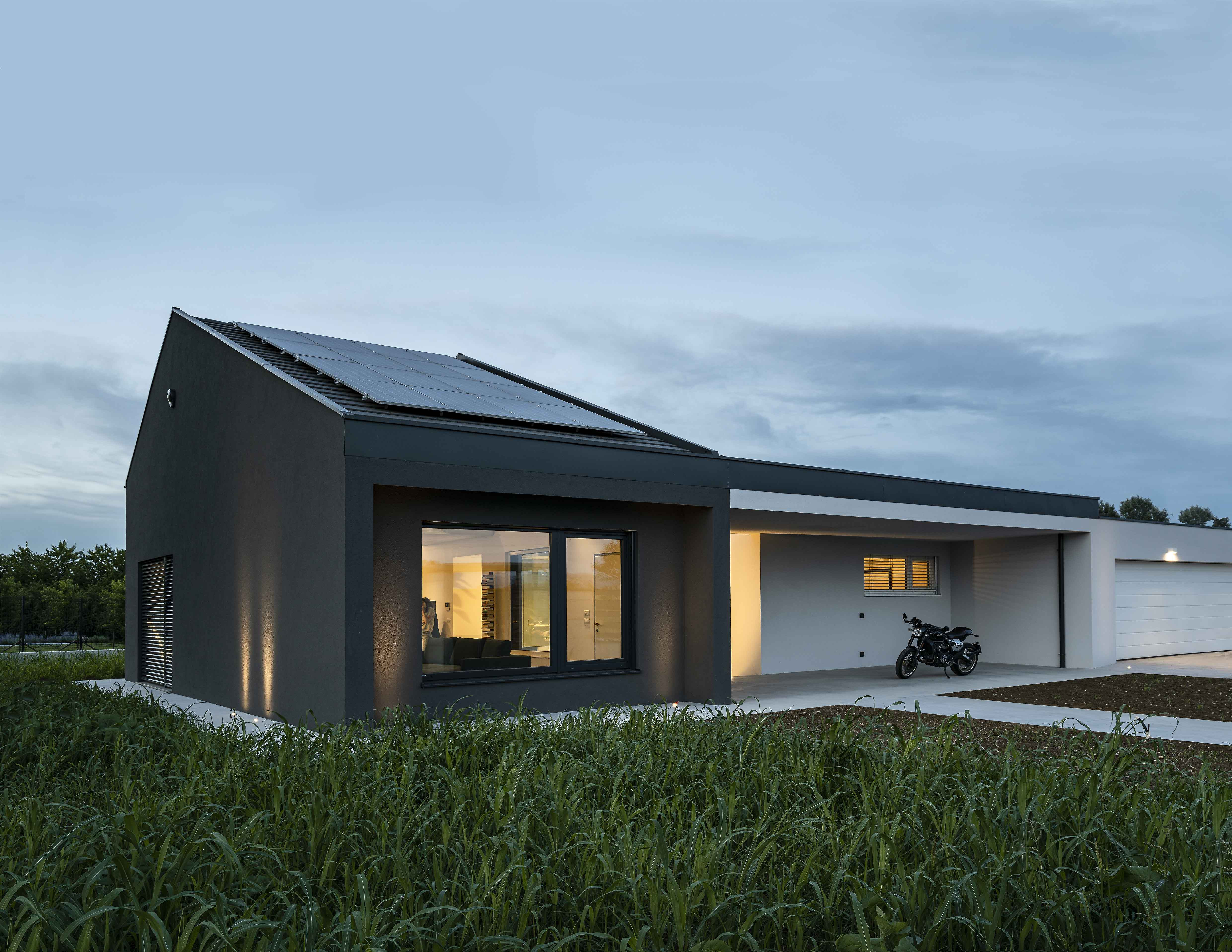 Il volume con tetto a capanna, vestito completamente di grigio, contiene la zona giorno; il volume centrale è rientrante e piantumato per invitare verso l’ingresso dell’abitazione, con un piccolo cortile piantumato e illuminato. L’ultimo volume è dedicato al box auto.