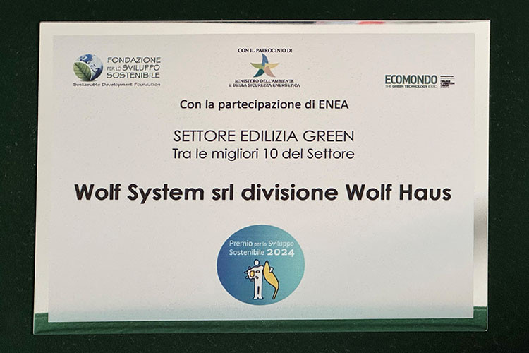 Venerdì 7 novembre 2024 Wolf Haus ha ritirato a Rimini il Premio Sviluppo Sostenibile 2024, istituito per il quattordicesimo anno dalla Fondazione per lo Sviluppo Sostenibile e da Italian Exhibition Group, con il Patrocinio del Ministero dell’ambiente e della Sicurezza Energetica.