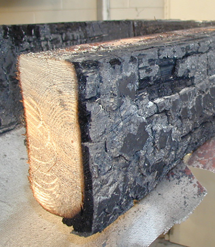 Il legno ha un comportamento differente dai due materiali analizzati in precedenza. Si tratta di un materiale organico che in caso di incendio partecipa al fenomeno perdendo massa. Una sezione di legno sottoposta a incendio si presenta con uno strato esterno carbonizzato mentre al di sotto di tale strato il materiale risulta intatto e con capacità meccaniche invariate. Il legno per sua natura è un ottimo materiale isolante e per questo motivo, durante un incendio, si forma superficialmente uno strato carbonizzato di circa 4 cm, che funge da “protezione”, sotto il quale la sezione lignea si presenta intatta. Le caratteristiche del legno in presenza di incendio sono parte integrante della progettazione strutturale; infatti la riduzione di sezione in modo costante,prevedibile e controllata porta a definire questo materiale come un buon materiale in caso di incendio.