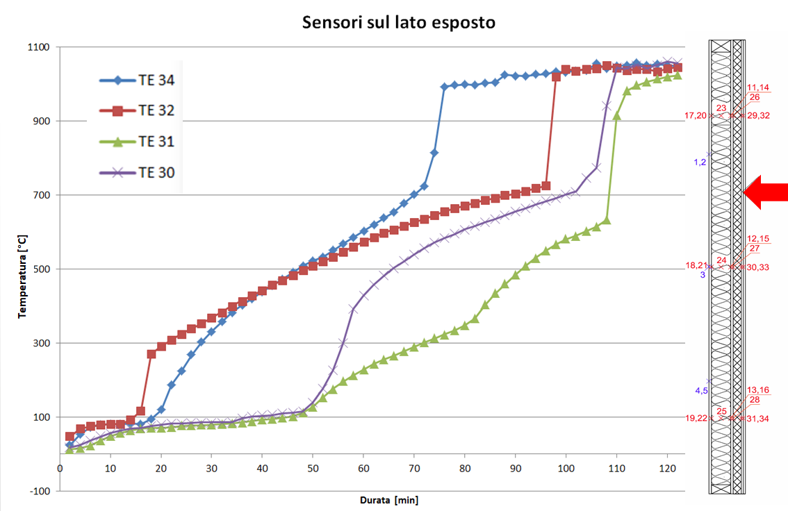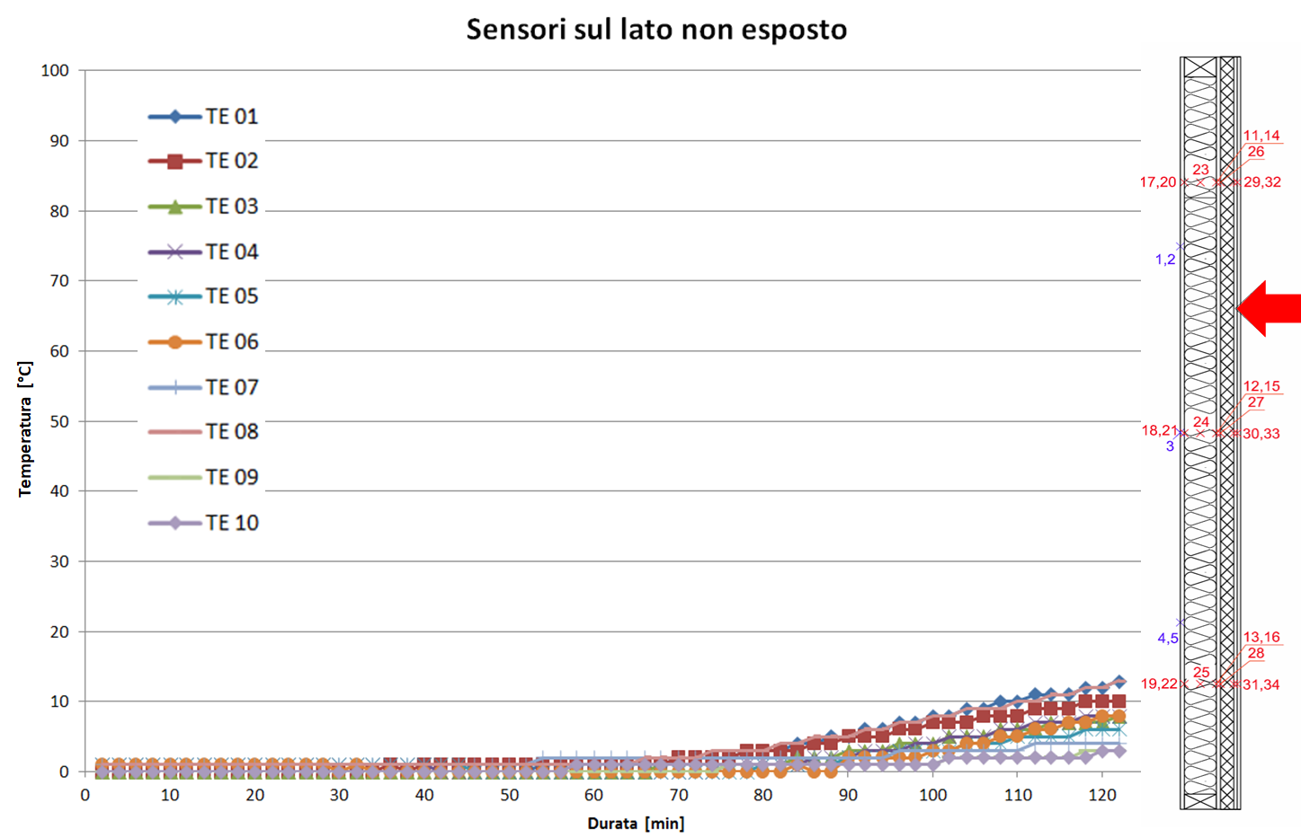 Prima della prova sono stati posizionati molti sensori in modo da rilevare l’andamento delle temperature nei diversi strati e in diverse posizioni. Durante la prova le temperature rilevate dai sensori variavano principalmente in base all’altezza e profondità di posizionamento dei sensori stessi e dal distacco localizzato di materiale sullo strato esterno esposto al fuoco. Sempre durante la prova, analizzando i dati dei sensori negli strati intermedi, ovvero tra i montanti, veniva rilevata dopo 120 minuti una temperatura massima di 85 °C.