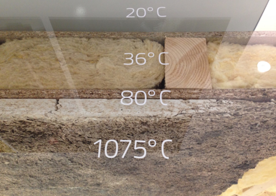 Per verificare lo stato della struttura dopo 120 minuti d’incendio si è deciso, una volta raggiunto il target necessario per la certificazione REI120, di interrompere la prova e visionare i singoli strati. Il doppio strato in cartongesso risultava essere completamente consumato lungo tutto lo sviluppo della parete. Lo strato in lana di legno cementizzata risultava essere ancora presente per circa il 50% del suo spessore totale. Rimosso tale strato, si è mostrato il pannello di controventamento completamente intatto.