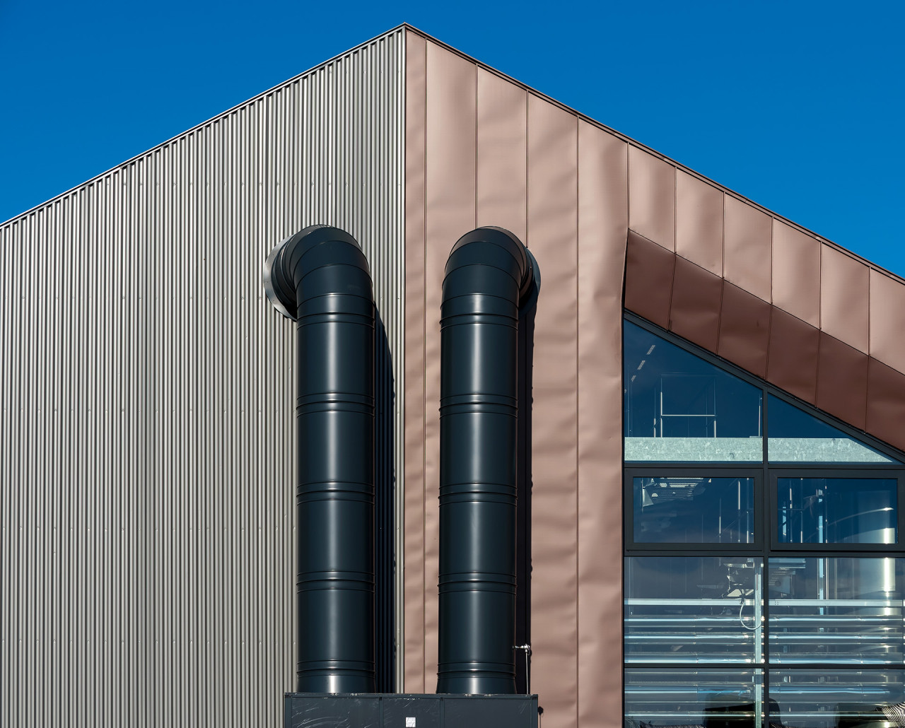 Nel primo caso si è trattato di una superficie di 2150 metri quadri con struttura primaria in travi reticolari in legno lamellare a pancia di pesce con intradosso curvo e luce statica di 30 m; per le pareti la superficie interessata è stata di 1630 metri quadri.