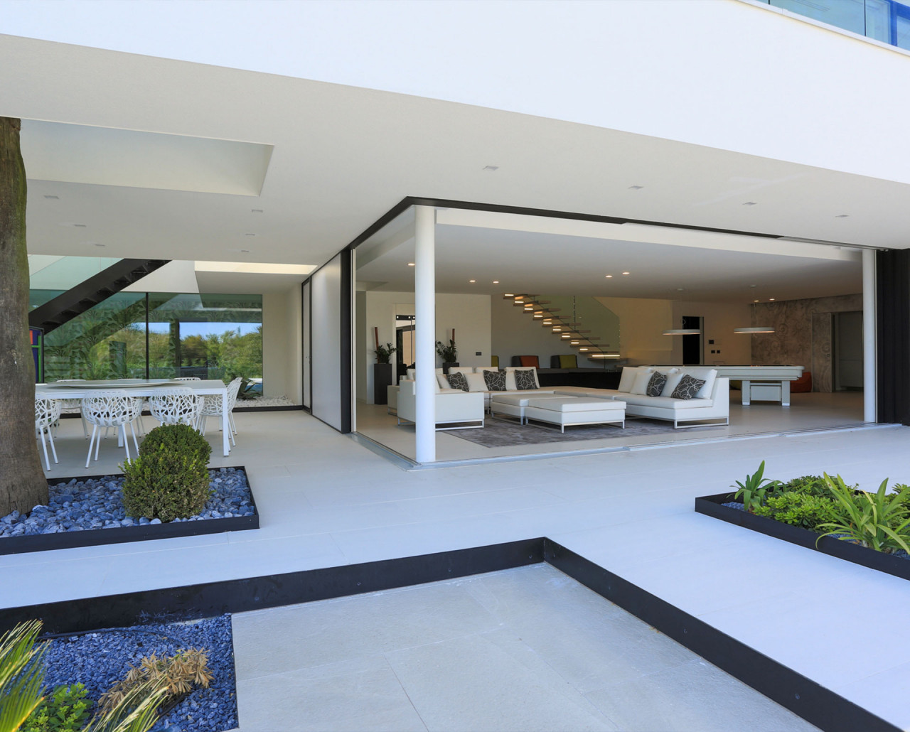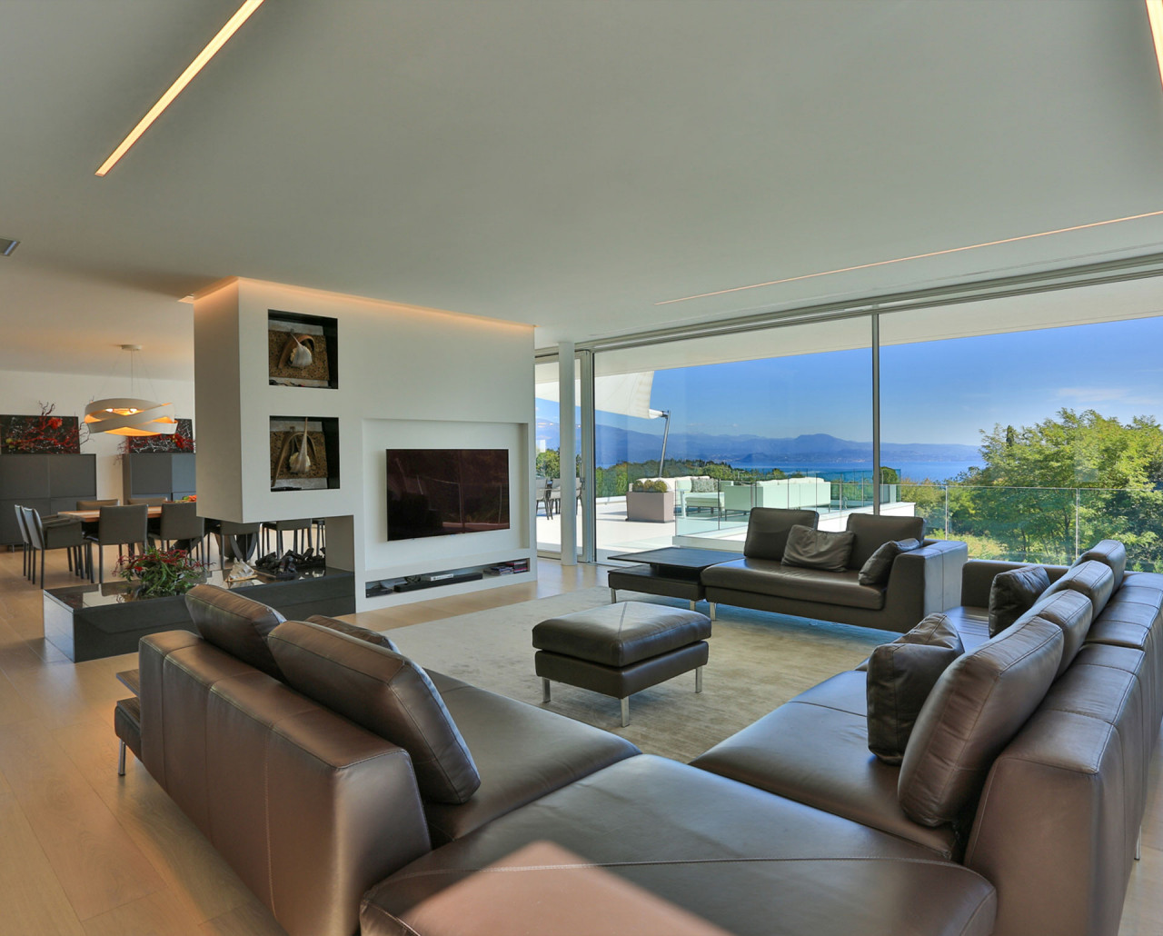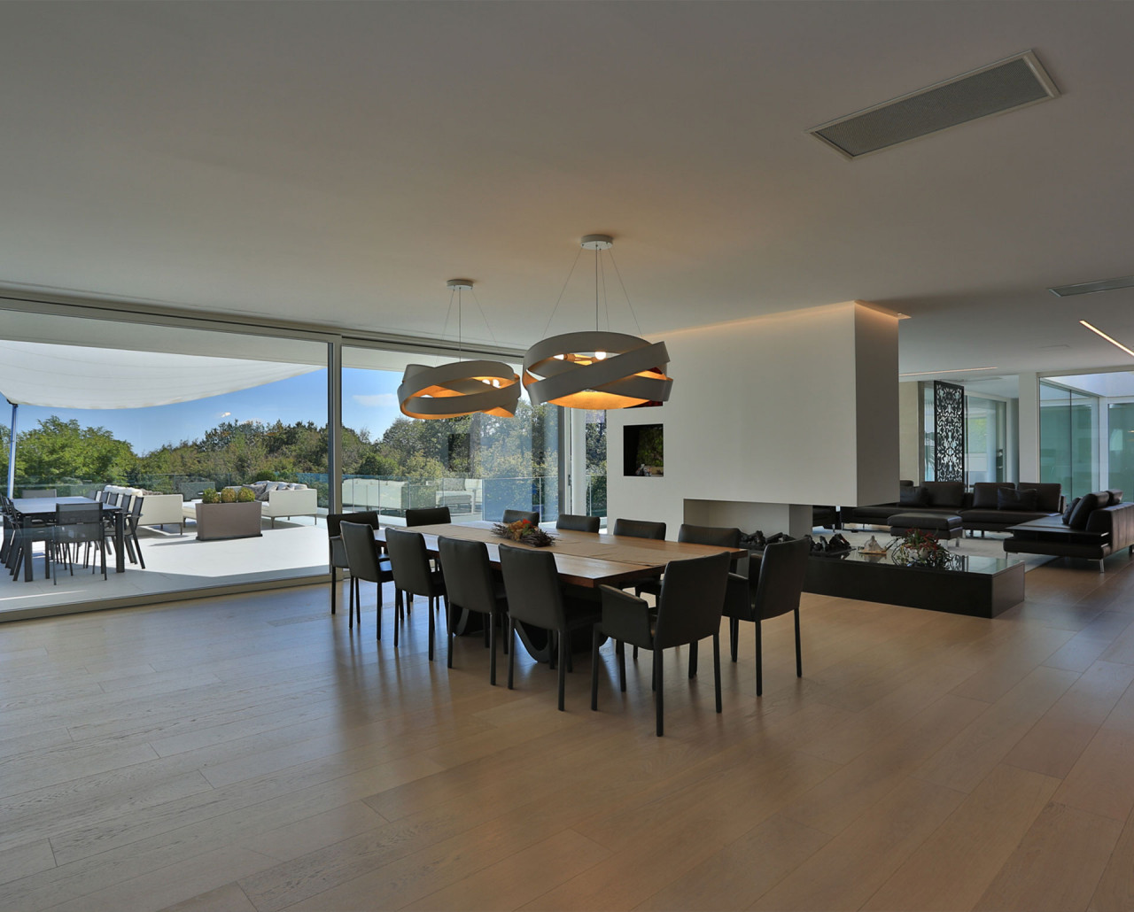 Lo sviluppo orizzontale delle linee e dei volumi di questa casa consente a ogni stanza di avere una vista differente sul panorama del lago e della piscina, offrendo ai proprietari e agli ospiti un’esperienza immersiva nell’ambiente naturale. Le vetrate scorrevoli, i generosi terrazzi ombreggiati e arredati, insieme ai parapetti trasparenti e alle superfici chiare che riflettono la luce naturale, creano un ambiente emozionale e lussuoso da vivere in continuità tra interno ed esterno.