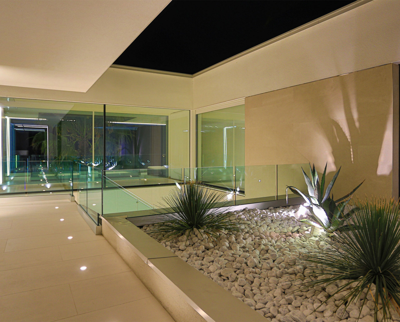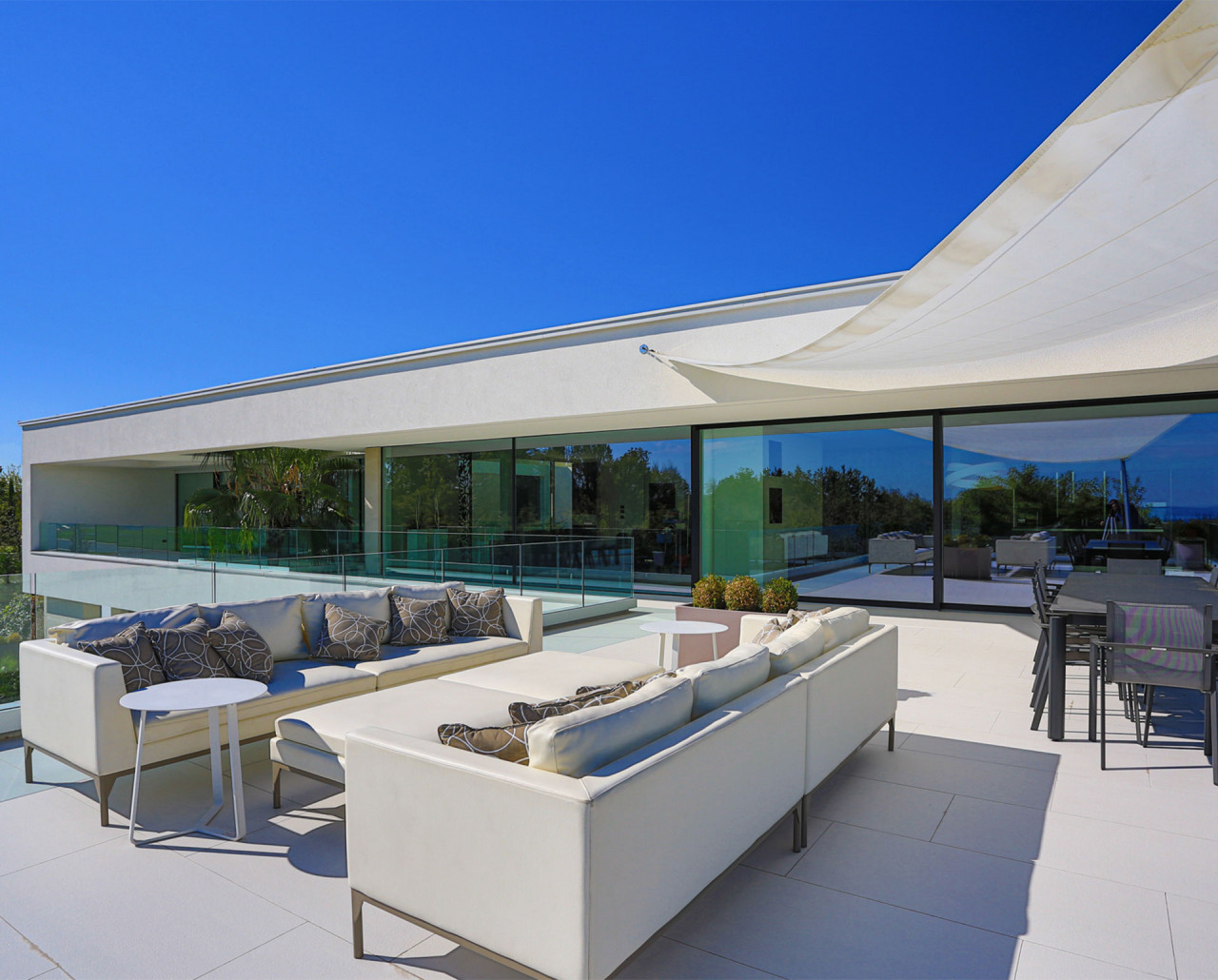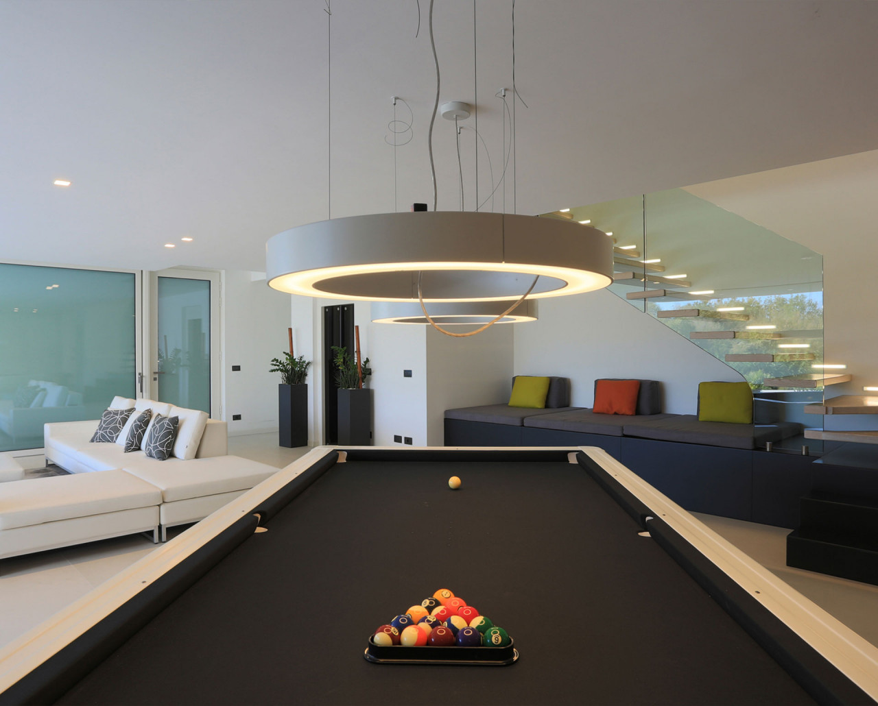 Lo sviluppo orizzontale delle linee e dei volumi di questa casa consente a ogni stanza di avere una vista differente sul panorama del lago e della piscina, offrendo ai proprietari e agli ospiti un’esperienza immersiva nell’ambiente naturale. Le vetrate scorrevoli, i generosi terrazzi ombreggiati e arredati, insieme ai parapetti trasparenti e alle superfici chiare che riflettono la luce naturale, creano un ambiente emozionale e lussuoso da vivere in continuità tra interno ed esterno.