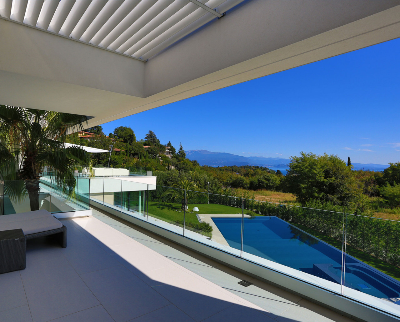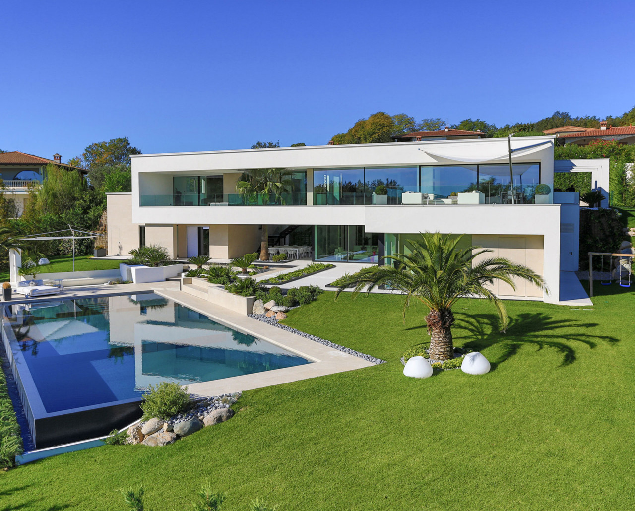 Sulla costa bresciana del Lago di Garda sorge una villa da sogno, contemporanea ed essenziale nelle sue geometrie intonacate di bianco.
